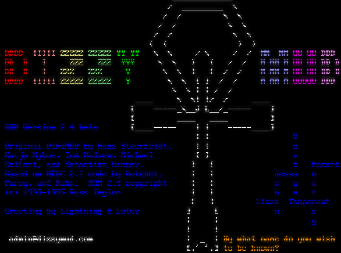 _​____________ / _​________ \\ / / \\ \\ / / \\ \\ / / \\ \\ ( ( ) ) DDDD IIIII ZZZZZ ZZZZZ YY YY \\ \\ / \\ / / MM MM UU UU DDD DD D I ZZZ ZZZ YYY \\ \\ ) ( / / M MM M UU UU DD D DD D I ZZZ ZZZ Y \\ \\ ] [ / / M MM M UU UU DD D DDDD IIIII ZZZZZ ZZZZZ Y \\ \\ [ ] / / M MM M UUUUU DDD \\ \\ \| \| / / _​___ \\ \\\| \|/ / _​___ [ -​----_\\__J L__/_​----- ] [ _​___ _​___ ] ROM Version 2.4 beta [_​___----- \| \| -​----____] \| \| V Original DikuMUD by Hans Staerfeldt, \| \| o Katja Nyboe, Tom Madsen, Michael [ ] r Seifert, and Sebastian Hammer. ] [ t Mozart Based on MERC 2.1 code by Hatchet, \| \| Jessa o Furey, and Kahn. ROM 2.4 copyright \| \| o y n (c) 1993-1995 Russ Taylor \| \| h n t [ ] Lissa Temperant Greeting by Lightning & Lotus ] [ n e \| \| y \| \| admin@dizzymud.com \| _ \| By what name do you wish [,' ',] to be known?