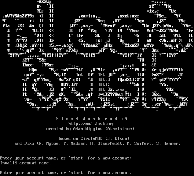 -axxug_ -,,,,, #\\ \`][ ysY^^'\`"Hxy ?Lr ][ =1x,g_ "Uxy .aV?Y5&aZY?9o <[ ][ .,xa#i;a,_ ,axzW;uxe '?5c_ "Y(_ 9' '^k +: \|[ ][ .jZF^ "5ng_ ,U?' \`?qx y,j2~ ?5g_ YIa .;2( #s Q[ ][ jJF^.,xa,- \`?5rxY' ,aa,z= "Ux jZF\\jx9m,% \`?5r_ # ]"^ k?U.\|[ d<E ][ky]F ^Y%g ?]Y# i9 d"?5sz Yn(^-JX%"?W9a ?}r # -​.__ 'V\|[ d<E (^ ]}r 3Lk ]k #g 95 :# ];d[ k9?Lk ][ # ]?~?9= ,V\|[ d]r (k -<5. ]s[ jJ \`Ugk ]V -a#- <9b,,aH')[ y]( # ]}&j2 .wY?\|[ 95,--,a;q(k '?Ysaa2~VjJHx ="Y1xaZ7 ywYYr \`?wuy,q~\\jJF\\ # ''\\jqY" }k '"??"laP}&gk jJP~kYq,I y'?" 3nz: ^​^^=,d2~k "YT?Y"~'.,,,,/"?YT!\|\|TY"^ '""YT\|TY~^ ^"YT!?"~]Y ][ ?~^!TY?^k j2?^''^5&z \`?Uy ]( ]hax- ??5sz -​..__ -,,,,w_ V= dE y HQm# "5,= -wY~^^?tF ,U"Y(r y,wY?^^''"Y5.V= <ryqjzY????1k ywY^ -,z- "8,lTyk: ]cL DY' ]KL jU"':,xe_ ]1V= }m2~F y =JE -J" 1qY"?5z_ '9s"%F q2( '# ]#L.]k !QadS1i;2^V= ?^ qd7"????^ ][ q? '?hg k#U?.]PF # ]#L]; k''"5h V= ??5, ][ "Q, J3 '#^ \`]L_ .# ]#L ]x,,aaa_k ] V= y_ d?Uxy ]t 'Y&g_.jZ =xX, \`"5&e .q! ]\*L}Z??0w;P?t[ y] V: ]Gxz "9a__ 9w- ?"YY~\\,qY'9x ?"Y?^ \`?1IE ^"??~k-Jf V! ??Y9hg ^"?5( "9a,. .,jY' k"hg_: :,aU- 'jj25,a. yjj2~^ Tq: .,er\`?m,-=.jdFF ^"?"""?~' '""?""?"'^?"​""~'d^"??"​"""~' "​""""F k""?"^k b l o o d d u s k m u d v9 http://mud.dusk.org created by Adam Wiggins (Athelstane) based on CircleMUD (J. Elson) and Diku (K. Nyboe, T. Madsen, H. Staerfeldt, M. Seifert, S. Hammer) Enter your account name, or 'start' for a new account: Invalid account name. Enter your account name, or 'start' for a new account: