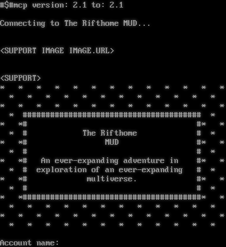 #$#mcp version: 2.1 to: 2.1 Connecting to The Rifthome MUD... <SUPPORT IMAGE IMAGE.URL> <SUPPORT> \* \* \* \* \* \* \* \* \* \* \* \* \* \* \* \* \* \* \* \* \* \* \* \* \* \* \* \* \* \* \* \* \* \* \* \* \* \* \* #​###################################### \* \* \*# #\* \* \* # The Rifthome # \* \* \*# MUD #\* \* \* # # \* \* \*# An ever-expanding adventure in #\* \* \* # exploration of an ever-expanding # \* \* \*# multiverse. #\* \* \* # # \* \* \*#​######################################\* \* \* \* \* \* \* \* \* \* \* \* \* \* \* \* \* \* \* \* \* \* \* \* \* \* \* \* \* \* \* \* \* \* \* \* \* \* \* Account name: