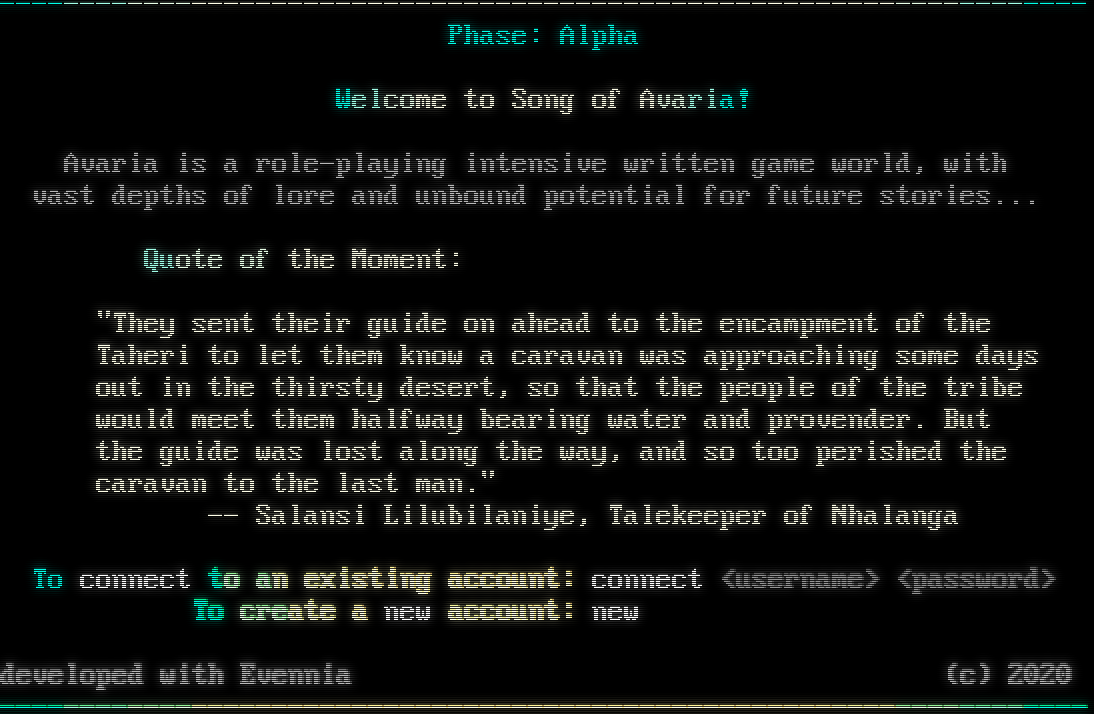 -​------------------------------------------------------------------- Phase: Alpha Welcome to Song of Avaria! Avaria is a role-playing intensive written game world, with vast depths of lore and unbound potential for future stories... Quote of the Moment: "They sent their guide on ahead to the encampment of the Taheri to let them know a caravan was approaching some days out in the thirsty desert, so that the people of the tribe would meet them halfway bearing water and provender. But the guide was lost along the way, and so too perished the caravan to the last man." -- Salansi Lilubilaniye, Talekeeper of Nhalanga To connect to an existing account: connect &lt;username&gt; &lt;password&gt; To create a new account: new developed with Evennia (c) 2020 -​-------------------------------------------------------------------