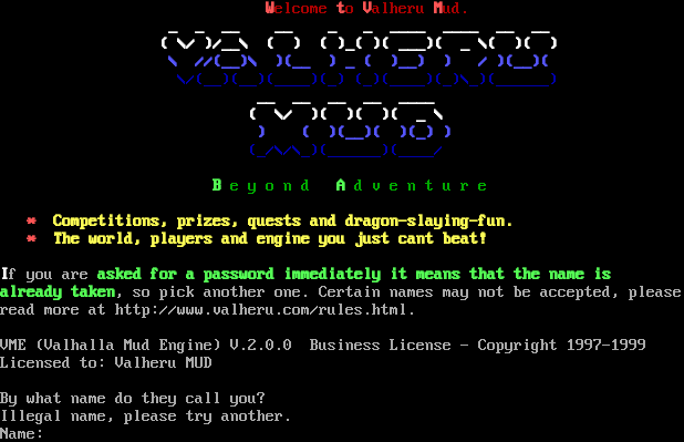 Welcome to Valheru Mud. _ _ __ __ _ _ _​___ _​___ __ __ ( \\/ )/__\\ ( ) ( )_( )( ___)( _ \\( )( ) \\ //(__)\\ )(__ ) _ ( )__) ) / )(__)( \\/(__)(__)(_​___)(_) (_)(_​___)(_)\\_)(_​_____) __ __ __ __ _​___ ( \\/ )( )( )( _ \\ ) ( )(__)( )(_) ) (_/\\/\\_)(_​_____)(_​___/ B e y o n d A d v e n t u r e \* Competitions, prizes, quests and dragon-slaying-fun. \* The world, players and engine you just cant beat! If you are asked for a password immediately it means that the name is already taken, so pick another one. Certain names may not be accepted, please read more at http://www.valheru.com/rules.html. VME (Valhalla Mud Engine) V.2.0.0 Business License - Copyright 1997-1999 Licensed to: Valheru MUD By what name do they call you? Illegal name, please try another. Name: