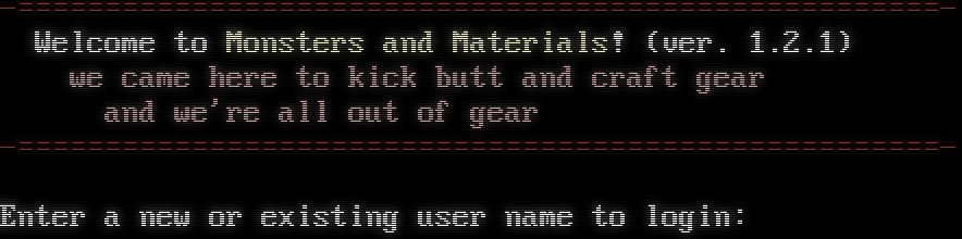 -​=====================================================- Welcome to Monsters and Materials! (ver. 1.2.1) we came here to kick butt and craft gear and we're all out of gear -​=====================================================- Enter a new or existing user name to login: