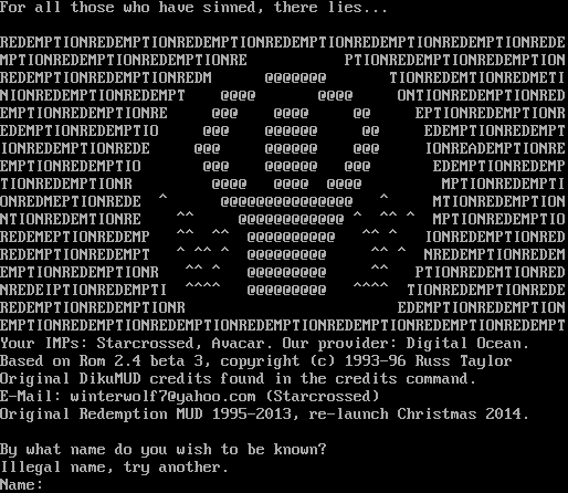 For all those who have sinned, there lies... REDEMPTIONREDEMPTIONREDEMPTIONREDEMPTIONREDEMPTIONREDEMPTIONREDE MPTIONREDEMPTIONREDEMPTIONRE PTIONREDEMPTIONREDEMPTION REDEMPTIONREDEMPTIONREDM @@@@@@@ TIONREDEMTIONREDMETI NIONREDEMPTIONREDEMPT @@@@ @@@@ ONTIONREDEMPTIONRED EMPTIONREDEMPTIONRE @@@ @@@@ @@ EPTIONREDEMPTIONR EDEMPTIONREDEMPTIO @@@ @@@@@@ @@ EDEMPTIONREDEMPT IONREDEMPTIONREDE @@@ @@@@@@ @@@ IONREADEMPTIONRE EMPTIONREDEMPTIO @@@ @@@@@@ @@@ EDEMPTIONREDEMP TIONREDEMPTIONR @@@@ @@@@ @@@@ MPTIONREDEMPTI ONREDMEPTIONREDE ^ @@@@@@@@@@@@@@@ ^ MTIONREDEMPTION NTIONREDEMTIONRE ^^ @@@@@@@@@@@@ ^ ^^ ^ MPTIONREDEMPTIO REDEMEPTIONREDEMP ^^ ^^ @@@@@@@@@@ ^^ ^ IONREDEMPTIONRED REDEMPTIONREDEMPT ^ ^^ ^ @@@@@@@@@ ^^ ^ NREDEMPTIONREDEM EMPTIONREDEMPTIONR ^^ ^ @@@@@@@@@ ^^ PTIONREDEMTIONRED NREDEIPTIONREDEMPTI ^​^^^ @@@@@@@@@ ^​^^^ TIONREDEMPTIONREDE REDEMPTIONREDEMPTIONR EDEMPTIONREDEMPTION EMPTIONREDEMPTIONREDEMPTIONREDEMPTIONREDEMPTIONREDEMPTIONREDEMPT Your IMPs: Starcrossed, Avacar. Our provider: Digital Ocean. Based on Rom 2.4 beta 3, copyright (c) 1993-96 Russ Taylor Original DikuMUD credits found in the credits command. E-Mail: winterwolf7@yahoo.com (Starcrossed) Original Redemption MUD 1995-2013, re-launch Christmas 2014. By what name do you wish to be known? Illegal name, try another. Name: