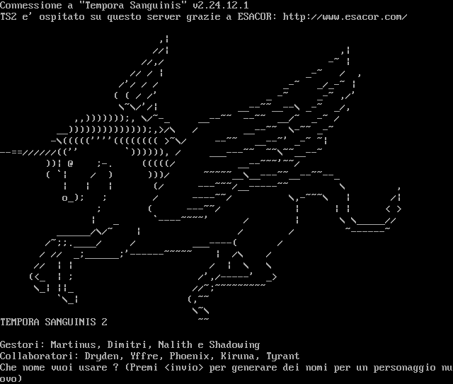 WELCOME TO : ___ - -_, , /\\\\,/\\\\, \|\\ _ ( ~/\|\| \|\| ' /\| \|\| \|\| \\\\ (-) ( / \|\| \\\\ \\\\ _-_, =\|\|= \\\\ \\\\/\\\\ \|\| \|\| \|\| \\\\ \\\\ / \\\\ (-) \\/==\|\| \|\| \|\| \|\|_. \|\| \|\| \|\| \|\| \|\|=\|= \|\| \|\| \|\| \|\| \|\| (-) /_ _\|\| \|\| \|\| ~ \|\| \|\| \|\| \|\| \|\| ~\|\| \|\| \|\| \|\| \|\| \|\| \|\| (-) ( - \\\\, \\\\/\\\\ ,-_- \\\\, \\\\ \\\\ \\\\ \|, \\\\,\\\\, \\\\/\\\\ \\\\/ (-) _- Version 5.5.6pl1 <=​=====(O)=​=====> \| \| \| \| \| \| Based on DikuMUD source by Katja Nyboe, Sebastian Hammer, \| \| Hans Henrik Staerfeldt, Michael Seifert, and Tom Madsen. \| \| \| \| World concept and initial coding by Lars Clausen, \| \| Bjarne Fich, Lars Balker Rasmussen, Lars Andersen \| \| and Jesper Larsen. \| \| \| \| Current implementors: Timos, Tigress \\_/ By what name do you wish to be known?