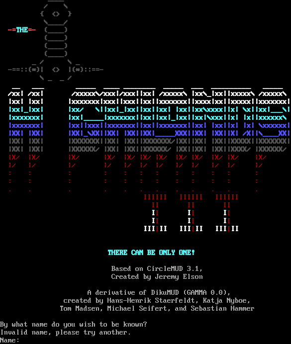 _​___ / \\ { <> } \\_​___/ -=THE=- (_​___) (_​___) (_​___) (_​___) _ / \\ _ -==::(\*)\| <> \|(\*)::==- \\ _ _ / __ ___\|@\|\|#\| _​____ _​___ _​_______ _​____ ___ _​_________ _​____ /xx\| /xx\|\| \| /xxxxx\\/xxx\|/xxx\|\|xx\| /xxxxx\\ \|xx\\_\|xx\|\|xxxxx\\ /xxxxx\\ \|xx\| \|xx\|\|@\|\|@\|\|xxxxxxx\|xxx\|\|xxx\|\|xx\|\|xxxxxxx\|\|xxxx\|xx\|\|xxxxx\|\|xxxxxxx\| \|xx\|_\|xx\|\|\|$\|$\|\|xx/ \\\|\|xx\|_\|xx\|\|xx\|\|xx\| \|xx\|\|xx\\xxxx\|\|x\| \\x\|\|xx\|___\\\| \|xxxxxxx\|\|%\|\|%\|\|xx\|_​____\|xxxxxxx\|\|xx\|\|xx\|_\|xx\|\|xx\|\\xxx\|\|x\| \|x\|\|xxxxxx\\ \|xxxxxxx\|\|\*\|\|\*\|\|xx\|\|xxx\|\|xxxxxxx\|\|xx\|\|xxxxxxx\|\|xx\| \|xx\|\|x\| \|x\| \\xxxxxx\| \|XX\| \|XX\|\|#\|\|#\|\|XX\|_\\XX\|\|XX\| \|XX\|\|XX\|_​____XXX\|\|XX\| \|XX\|\|X\| /X\|\|\\_​___XX\| \|XX\| \|XX\|\|_ _\|\|XXXXXXX\|\|XX\| \|XX\|\|XXXXXXX/\|XX\|\|XX\| \|XX\|\|XXXXX\|\|XXXXXXX\| \|XX\| \|XX\|\|%\|\|%\|\|XXXXXX/ \|XX\| \|XX\|\|XXXXXX/ \|XX\|\|XX\| \|XX\|\|XXXX/ \|XXXXXX/ \|X/ \|X/ \|\*\|\|\*\|\|X/ \|X/ \|X/ \|X/ \|X/ \|X/ \|X/ \|X/ \|X/ \|X/ \|/ \|/ \|@\|\|@\|\|/ \|/ \|/ \|/ \|/ \|/ \|/ \|/ \|/ \|/ : : \|$\|\|$\|: : : : : : : : : : : : \|%\|\|%\|: : : : : : : : : : . . \|\*\|\|\*\|. . . . . . . . . . \|@\|\|@\| IIIIII IIIIII IIIIII \|$\|\|$\| II II II \\ \|\| / II II II \\\\// II II II \\/ IIIIII IIIIII IIIIII THERE CAN BE ONLY ONE! Based on CircleMUD 3.1, Created by Jeremy Elson A derivative of DikuMUD (GAMMA 0.0), created by Hans-Henrik Staerfeldt, Katja Nyboe, Tom Madsen, Michael Seifert, and Sebastian Hammer By what name do you wish to be known? Invalid name, please try another. Name: