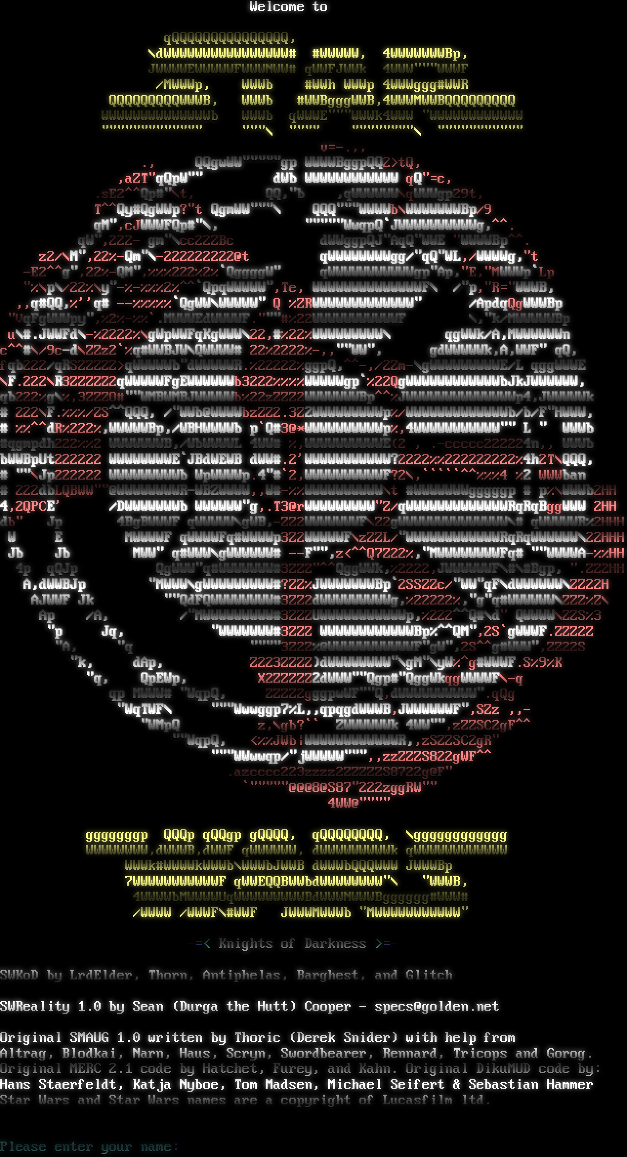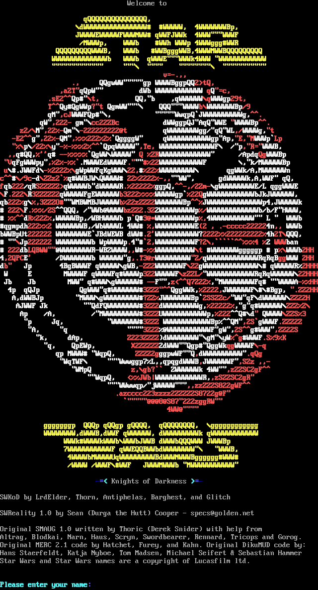 Welcome to qQQQQQQQQQQQQQQQ, \\dWWWWWWWWWWWWWWWW# #WWWWW, 4WWWWWWWBp, JWWWWEWWWWWFWWWNWW# qWWFJWWk 4WWW"""WWWF /MWWWp, WWWb #WWh WWWp 4WWWggg#WWR QQQQQQQQQWWWB, WWWb #WWBgggWWB,4WWWMWWBQQQQQQQQQ WWWWWWWWWWWWWWb WWWb qWWWE"""WWWk4WWW "WWWWWWWWWWWW "​"""""""""""" """\\ "​""" "​"""""""\\ "​"""""""""" v=-.,, ., QQgwWW"​""""gp WWWWBggpQQ2>tQ, ,aZT"qQpW"" dWb WWWWWWWWWWWW qQ"=c, .sE2^^Qp#"\\t, QQ,"b ,qWWWWWW\\qWWWgp29t, T^^Qy#QgWWp?"t QgmWW"""\\ QQQ"""WWWWb\\WWWWWWWBp/9 qM",cJWWWFQp#"\\, "​""""WwqpQ\`JWWWWWWWWWWg,^^. qW",222- gm"\\cc22ZBc dWWggpQJ"AqQ"WWE "WWWWBp^^. z2/\\M",22%-Qm"\\-222222222@t qWWWWWWWWgg/"qQ"WL,/WWWWg,"t -E2^^g",22%-QM",%%%222%2%\`QggggW" qWWWWWWWWWWWgp"Ap,"E,"MWWWp\`Lp "%\\p\\/22%\\y"-%-%%%2%^^\`QpqWWWWW",Te, WWWWWWWWWWWWWWF\\ /"p,"R="WWWB, ,,q#QQ,%''q# --%%%%%\`QgWW\\WWWWW" Q %ZRWWWWWWWWWWWWW" /ApdqQgWWWBp "VqFgWWWpy",%2%-%%\`.MWWWEdWWWWF.​"""#%22WWWWWWWWWWWF \\,"k/MWWWWWBp u\\#.JWWFd\\-%2222%\\gWpWWFqKgWWW\\22,#%22%WWWWWWWWW\\ qgWWk/A,MWWWWWWn c^^#\\/9c-d\\ZZz2\`%q#WWBJW\\QWWWW# 22%2222%-,,""WW", gdWWWWWk,A,WWF" qQ, fqb222/qRSZZZZZ>qWWWWWb"dWWWWWR.%22222%ggpQ,^^-,/2Zm-\\gWWWWWWWWWE/L qggWWWE \\F.222\\R3ZZZZZ2qWWWWWFgEWWWWWWb3222%%%%WWWWWgp\`%22QgWWWWWWWWWWWWbJkJWWWWWW, qb222%g\\%,3ZZZO#""WMBWMBJWWWWWb%22zZZZ2WWWWWWWBp^^%JWWWWWWWWWWWWWWp4,JWWWWWk # 222\\F.%%%/ZS^^QQQ, /"WWb@WWWWbzZZ2.3Z2WWWWWWWWWp%/WWWWWWWWWWWWWb/b/F"HWWW, # %%^^dR%222%,WWWWWBp,/WBHWWWWb p\`Q#3@\*WWWWWWWWWWp%,4WWWWWWWWWWW"" L " WWWb #qgmpdh222%%2 WWWWWWWB,/WbWWWWL 4WW# %,WWWWWWWWWWE(2 , .-ccccc222224n,, WWWb bWWBpUt222222 WWWWWWWWE\`JBdWEWB dWW#.2'WWWWWWWWWWW?2222%%222222222%4h2T\\QQQ, # ""\\Jp222222 WWWWWWWWWb WpWWWWp.4"#\`2,WWWWWWWWWWF?2\\,\`\`\`\`\`^^%%%4 %2 WWWban # 222dbLQBWW""@WWWWWWWWR-WBZWWWW,,W#-%%WWWWWWWWWW\\t #WWWWWWWgggggp # p%\\WWWb2HH 4,2QPCE' /DWWWWWWWb WWWWWW"g,.T3@rWWWWWWWWW"Z/qWWWWWWWWWWWWWRqRqBggWWW 2HH db" Jp 4BgBWWWF qWWWWW\\gWB,-ZZ2WWWWWWWF\\Z2gWWWWWWWWWWWWWW\\# qWWWWWR%2HHH W E MWWWWF qWWWWFq#WWWWp3Z2WWWWWF\\zZZL/"WWWWWWWWWWWWRqRqWWWWWW\\22HHH Jb Jb MWW" q#WWW\\gWWWWWW# --F"",z<^^Q7Z22%,"MWWWWWWWWFq# ""WWWWA-%%HH 4p qQJp QgWWW"q#WWWWWWW#3ZZZ"^^QggWWk,%2222,JWWWWWWF\\#\\#Bgp, ".ZZ2HH A,dWWBJp "MWWW\\gWWWWWWWWW#?ZZ%JWWWWWWWBp\`2SSZZc/"WW"qF\\dWWWWWW\\ZZ22H AJWWF Jk ""QdFQWWWWWWWW#3ZZ2dWWWWWWWWWg,%22222%,"g"q#WWWWWW\\ZZZ%Z\\ Ap /A, /"MWWWWWWWWW#3ZZZUWWWWWWWWWWWp,%222^^Q#\\d" QWWWW\\ZZS%3 "p Jq, "WWWWWWW#3ZZZ WWWWWWWWWWWWBp%^^QM",2S\`gWWWF.ZZZ2Z "A, "q "​"""3Z2Z%@WWWWWWWWWWWF"gW",2S^^g#WWW",ZZ22S "k, dAp, Z223ZZZZ)dWWWWWWWW"\\gM"\\yW%^g#WWWF.S%9%K "q, QpEWp, X2ZZZZZ2dWWW""Qgp#"QggWkqgWWWWF\\-q qp MWWW# "WqpQ, ZZZZ2gggpwWF""Q,dWWWWWWWWWW".qQg "WqTWF\\ """Wwwggp7%L,,qpqgdWWWB,JWWWWWWF",SZz ,,- "WMpQ z,\\gb?\`\` ZWWWWWWk 4WW"",zZZSC2gF^^ ""WqpQ, <%%JWb\|WWWWWWWWWWWWR,,zSZZSC2gR" """WWwwqp/"jWWWWW""",,zzZZZS822gWF^^ .azcccc223zzzz2ZZZZZS8722g@F" \`"​""""@@@8@S87"222zggRW"" 4WW@"​""" gggggggp QQQp qQQgp gQQQQ, qQQQQQQQQ, \\gggggggggggg WWWWWWWW,dWWWB,dWWF qWWWWWW, dWWWWWWWWWk qWWWWWWWWWWWW WWWk#WWWWkWWWb\\WWWbJWWB dWWWbQQQWWW JWWWBp 7WWWWWWWWWWWF qWWEQQBWWbdWWWWWWWW"\\ "WWWB, 4WWWWbMWWWWUqWWWWWWWWWBdWWWNWWWBgggggg#WWW# /WWWW /WWWF\\#WWF JWWWMWWWb "MWWWWWWWWWWW" -=< Knights of Darkness >=- SWKoD by LrdElder, Thorn, Antiphelas, Barghest, and Glitch SWReality 1.0 by Sean (Durga the Hutt) Cooper - specs@golden.net Original SMAUG 1.0 written by Thoric (Derek Snider) with help from Altrag, Blodkai, Narn, Haus, Scryn, Swordbearer, Rennard, Tricops and Gorog. Original MERC 2.1 code by Hatchet, Furey, and Kahn. Original DikuMUD code by: Hans Staerfeldt, Katja Nyboe, Tom Madsen, Michael Seifert & Sebastian Hammer Star Wars and Star Wars names are a copyright of Lucasfilm ltd. Please enter your name: