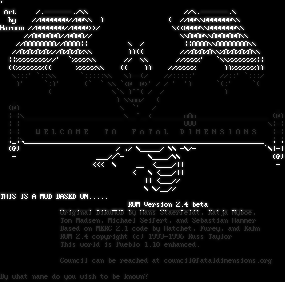 ' Art /.​-------./\\\\ //\\.​-------.\\ by //@@@@@@@//@@\\\\ ) ( //@@\\\\@@@@@@@\\\\ Haroon //@@@@@@@//@@@@>>/ \\<<@@@@\\\\@@@@@@@\\\\ //O@O@O@O//@O@O// \\\\O@O@\\\\O@O@O@O\\\\ //OOOOOOOO//OOOO\|\| \\ / \|\|OOOO\\\\OOOOOOOO\\\\ //O%O%O%O%//O%O%O%\\\\ ))(( //%O%O%O\\\\%O%O%O%O\\\\ \|\|%%%%%%%%//' \`%%%%\\\\ // \\\\ //%%%%' \`\\\\%%%%%%%\|\| ((%%%%%%%(( %%%%%\\\\ (( )) //%%%%% ))%%%%%%)) \\:::' \`::\\\\ \`:::::\\\\ \\)--(/ //:::::' //::' \`:::/ )' \`;)' (\` \` \\\\ \`<@ @>' / / ' ') \`(;' \`( ( \\\`\\ )^^( / / ) _ ) \\\\oo/ ( (@) \\ \`' / _ \|-\|\\_​________________________\\_​_^__<_​_______oOo_​_________________ (@) \| \| VVV \\\|-\| \|-\| W E L C O M E T O F A T A L D I M E N S I O N S \|-\| \|_\|\\_​___________________________________________________________ \| \| (@) / ,/ \\_​____/ \\\\ -\\/- \`\\\|-\| - ___//^- \\_​___/\\\\ (@) <<< \\ __ <_​___/\|\| - < \\ <___/\|\| \|\| <___// \\ \\/__// THIS IS A MUD BASED ON.​.... ROM Version 2.4 beta Original DikuMUD by Hans Staerfeldt, Katja Nyboe, Tom Madsen, Michael Seifert, and Sebastian Hammer Based on MERC 2.1 code by Hatchet, Furey, and Kahn ROM 2.4 copyright (c) 1993-1996 Russ Taylor This world is Pueblo 1.10 enhanced. Council can be reached at council@fataldimensions.org By what name do you wish to be known?