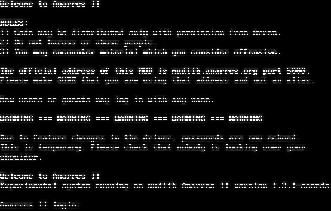 Welcome to Anarres II RULES: 1) Code may be distributed only with permission from Arren. 2) Do not harass or abuse people. 3) You may encounter material which you consider offensive. The official address of this MUD is mudlib.anarres.org port 5000. Please make SURE that you are using that address and not an alias. New users or guests may log in with any name. WARNING === WARNING === WARNING === WARNING === WARNING Due to feature changes in the driver, passwords are now echoed. This is temporary. Please check that nobody is looking over your shoulder. Welcome to Anarres II Experimental system running on mudlib Anarres II version 1.3.1-coords Anarres II login: