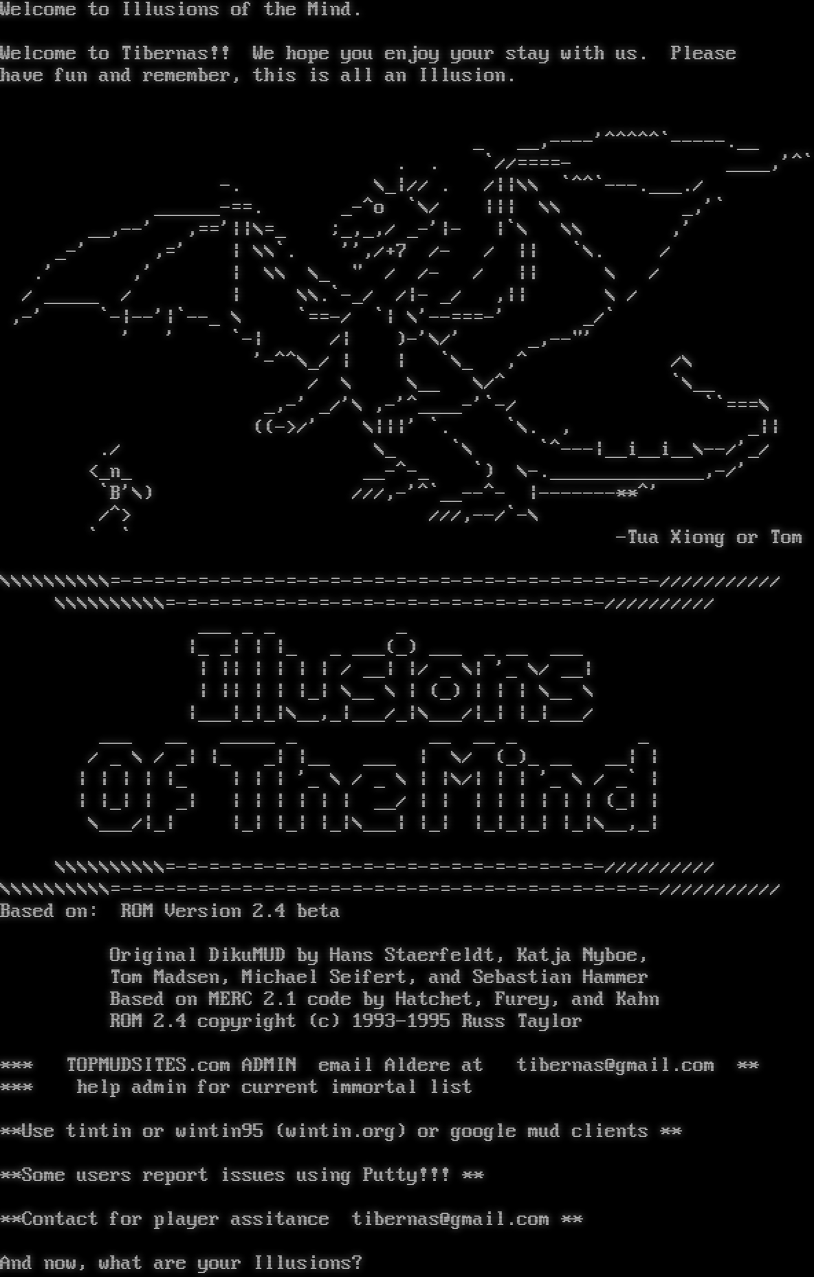 Welcome to Illusions of the Mind. Welcome to Tibernas!! We hope you enjoy your stay with us. Please have fun and remember, this is all an Illusion. _ __,-​---'^​^^^^\`-​----.__ . . \`//=​===- _​___,'^\` -. \\_\|// . /\|\|\\\\ \`^^\`-​--.___./ _​_____-==. _-^o \`\\/ \|\|\| \\\\ _,'\` __,--' ,=='\|\|\\=_ ;_,_,/ _-'\|- \|\`\\ \\\\ ,' _-' ,=' \| \\\\\`. '',/+7 /- / \|\| \`\\. / .' ,' \| \\\\ \\_ " / /- / \|\| \\ / / _​____ / \| \\\\.\`-_/ /\|- _/ ,\|\| \\ / ,-' \`-\|--'\|\`--_ \\ \`==-/ \`\| \\'-​-===-' _/\` ' ' \`-\| /\| )-'\\/' _,--"' '-^^\\_/ \| \| \`\\_ ,^ /\\ / \\ \\__ \\/^ \`\\__ _,-' _/'\\ ,-'^​____-'\`-/ \`\`===\\ ((->/' \\\|\|\|' \`. \`\\. , _\|\| ./ \\_ \`\\ \`^​---\|__i__i__\\--/'_/ <_n_ _​_-^-_ \`) \\-​.______________,-/' \`B'\\) ///,-'^\`_​_--^- \|-​------\*\*^' /^> ///,--/\`-\\ \` \` -Tua Xiong or Tom \\\\\\\\\\\\\\\\\\\\=​-=-=-=-=-=-=-=-=-=-=-=-=-=-=-=-=-=-=-=-=-=-=-=-=-/////////// \\\\\\\\\\\\\\\\\\\\=​-=-=-=-=-=-=-=-=-=-=-=-=-=-=-=-=-=-=-=-////////// ___ _ _ _ \|_ _\| \| \|_ _ ___(_) ___ _ __ ___ \| \|\| \| \| \| \| / __\| \|/ _ \\\| '_ \\/ __\| \| \|\| \| \| \|_\| \\__ \\ \| (_) \| \| \| \\__ \\ \|___\|_\|_\|\\__,_\|___/_\|\\___/\|_\| \|_\|___/ ___ __ _​____ _ __ __ _ _ / _ \\ / _\| \|_ _\| \|__ ___ \| \\/ (_)_ __ __\| \| \| \| \| \| \|_ \| \| \| '_ \\ / _ \\ \| \|\\/\| \| \| '_ \\ / _\` \| \| \|_\| \| _\| \| \| \| \| \| \| __/ \| \| \| \| \| \| \| \| (_\| \| \\___/\|_\| \|_\| \|_\| \|_\|\\___\| \|_\| \|_\|_\|_\| \|_\|\\__,_\| \\\\\\\\\\\\\\\\\\\\=​-=-=-=-=-=-=-=-=-=-=-=-=-=-=-=-=-=-=-=-////////// \\\\\\\\\\\\\\\\\\\\=​-=-=-=-=-=-=-=-=-=-=-=-=-=-=-=-=-=-=-=-=-=-=-=-=-/////////// Based on: ROM Version 2.4 beta Original DikuMUD by Hans Staerfeldt, Katja Nyboe, Tom Madsen, Michael Seifert, and Sebastian Hammer Based on MERC 2.1 code by Hatchet, Furey, and Kahn ROM 2.4 copyright (c) 1993-1995 Russ Taylor \*\*\* TOPMUDSITES.com ADMIN email Aldere at tibernas@gmail.com \*\* \*\*\* help admin for current immortal list \*\*Use tintin or wintin95 (wintin.org) or google mud clients \*\* \*\*Some users report issues using Putty!!! \*\* \*\*Contact for player assitance tibernas@gmail.com \*\* And now, what are your Illusions?