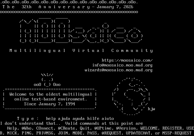 .oOo.oOo.oOo.oOo.oOo.oOo.oOo.oOo.oOo.oOo.oOo.oOo.oOo.oOo. T h e 32th A n n i v e r s a r y - January 7, 2026 ooooooooooooooooooooooooooooooooooooooooooooooooooooooooo _​____ _​____ /'\\_/\`\\( _ )( _ ) _ \| \|\| ( ) \|\| ( ) \| ___ _ _ (_) ___ _ \| (_) \|\| \| \| \|\| \| \| \|/',__) /'_\` )\| \| /'___) /'_\`\\ \| \| \| \|\| (_) \|\| (_) \|\\__, \\( (_\| \|\| \|( (___ ( (_) ) (_) (_)(_​____)(_​____)(_​___/\`\\__,_)(_)\`\\_​___)\`\\___/' M u l t i l i n g u a l V i r t u a l C o m m u n i t y https://moosaico.com/ info@moosaico.moo.mud.org wizards@moosaico.moo.mud.org \\\\\|// (. .) .-'';'-. ooO (_) Ooo ,' <_,-.\`. .​=====================================. /) ,--,_>\\_\\ \| Welcome to the oldest multilingual \| \|' ( \\_ \| \| online text-based environment. \| \|_ \`-. / \| \| Since January 7, 1994 \| \\\`-. ; _(\`/ \`-​------------------------------------' \`.( \\/ ,' hjw \`-​....-' T y p e : help ajuda ayuda hilfe aiuto I don't understand that.. Valid commands at this point are Help, @Who, COnnect, @CReate, Quit, @UPtime, @Version, WELCOME, REGISTER, USER, NICK, PING, PRIVMSG, JOIN, MODE, PASS, @REQUEST, UPDATECHAT, or MSSP-REQUEST