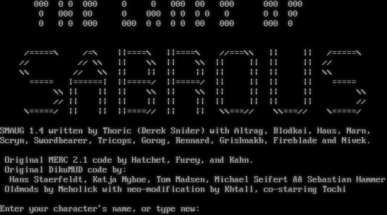 000 0 0 000 0 0 000 00 000 000 000 0 000 00 0 000 0 0 0 0 0 0 0 00 0 0 0 000 000 0 0 0 0 00 000 000 0 /=​====\\ /=\\ \|\|=​===\\ \|\|=​===\\ //===\\\\ \|\| \|\| /=​====\\ // // \\\\ \|\| \\\\ \|\| \\\\ \|\| \|\| \|\| \|\| // \\\\ // \\\\ \|\| \|\| \|\| \|\| \|\| \|\| \|\| \|\| \\\\ =​==== \|=​=====\| \|\|=​====/ \|\|=​====/ \|\| \|\| \|\| \|\| =​==== \\\\ \|\| \|\| \|\| \\\\ \|\| \\\\ \|\| \|\| \|\| \|\| \\\\ // \|\| \|\| \|\| \|\| \|\| \|\| \|\| \|\| \|\| \|\| // \\=​====/ \|\| \|\| \|\|=​===// \|\| \|\| \\\\===// \\\\===// \\=​====/ SMAUG 1.4 written by Thoric (Derek Snider) with Altrag, Blodkai, Haus, Narn, Scryn, Swordbearer, Tricops, Gorog, Rennard, Grishnakh, Fireblade and Nivek. Original MERC 2.1 code by Hatchet, Furey, and Kahn. Original DikuMUD code by: Hans Staerfeldt, Katja Nyboe, Tom Madsen, Michael Seifert && Sebastian Hammer Oldmods by Meholick with neo-modification by Khtall, co-starring Tochi Enter your character's name, or type new: