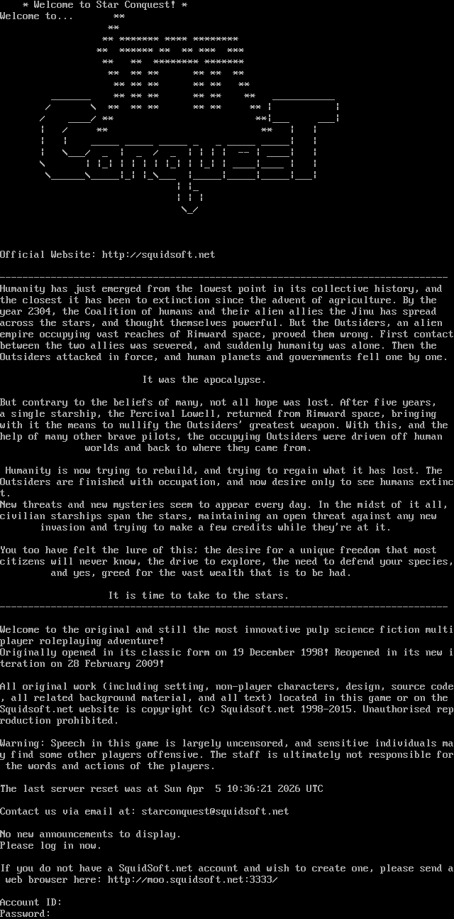 \* Welcome to Star Conquest! \* Welcome to... \*\* \*\* \*\* \*\*\*\*\*\*\* \*\*\*\* \*\*\*\*\*\*\*\* \*\* \*\*\*\*\*\* \*\* \*\* \*\*\* \*\*\* \*\* \*\* \*\*\*\*\*\*\*\* \*\*\*\*\*\*\* \*\* \*\* \*\* \*\* \*\* \*\* \*\* \*\* \*\* \*\* \*\* \*\* _​______ \*\* \*\* \*\* \*\* \*\* \*\* _​__________ / \\ \*\* \*\* \*\* \*\* \*\* \*\* \| \| / _​___/ \*\* \*\*\|___ ___\| \| / \*\* \*\* \| \| \| \| _​____ _​____ _​____ _ _ _​____ _​____\| \| \| \\___/ _ \| _ / _ \| \| \| \| -- \| _​___\| \| \\ \| \|_\| \| \| \| \| \|_\| \| \|_\| \| _​___\|_​___ \| \| \\_​_____\\_​____\|_\| \|_\\___ \|_​____\|_​____\|_​____\|___\| \| \|_ \| \| \| \\_/ Official Website: http://squidsoft.net -​------------------------------------------------------------------------------ Humanity has just emerged from the lowest point in its collective history, and the closest it has been to extinction since the advent of agriculture. By the year 2304, the Coalition of humans and their alien allies the Jinu has spread across the stars, and thought themselves powerful. But the Outsiders, an alien empire occupying vast reaches of Rimward space, proved them wrong. First contact between the two allies was severed, and suddenly humanity was alone. Then the Outsiders attacked in force, and human planets and governments fell one by one. It was the apocalypse. But contrary to the beliefs of many, not all hope was lost. After five years, a single starship, the Percival Lowell, returned from Rimward space, bringing with it the means to nullify the Outsiders' greatest weapon. With this, and the help of many other brave pilots, the occupying Outsiders were driven off human worlds and back to where they came from. Humanity is now trying to rebuild, and trying to regain what it has lost. The Outsiders are finished with occupation, and now desire only to see humans extinct. New threats and new mysteries seem to appear every day. In the midst of it all, civilian starships span the stars, maintaining an open threat against any new invasion and trying to make a few credits while they're at it. You too have felt the lure of this; the desire for a unique freedom that most citizens will never know, the drive to explore, the need to defend your species, and yes, greed for the vast wealth that is to be had. It is time to take to the stars. -​------------------------------------------------------------------------------ Welcome to the original and still the most innovative pulp science fiction multiplayer roleplaying adventure! Originally opened in its classic form on 19 December 1998! Reopened in its new iteration on 28 February 2009! All original work (including setting, non-player characters, design, source code, all related background material, and all text) located in this game or on the Squidsoft.net website is copyright (c) Squidsoft.net 1998-2015. Unauthorised reproduction prohibited. Warning: Speech in this game is largely uncensored, and sensitive individuals may find some other players offensive. The staff is ultimately not responsible for the words and actions of the players. The last server reset was at Sun Apr 5 10:36:21 2026 UTC Contact us via email at: starconquest@squidsoft.net No new announcements to display. Please log in now. If you do not have a SquidSoft.net account and wish to create one, please send a web browser here: http://moo.squidsoft.net:3333/ Account ID: Password: