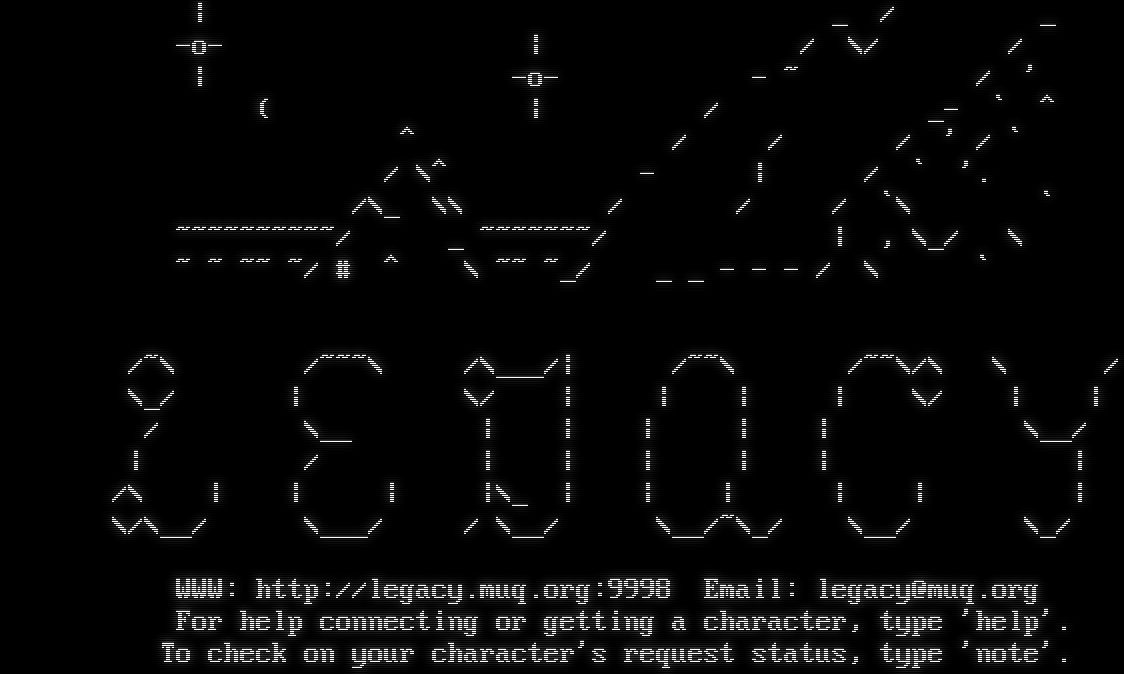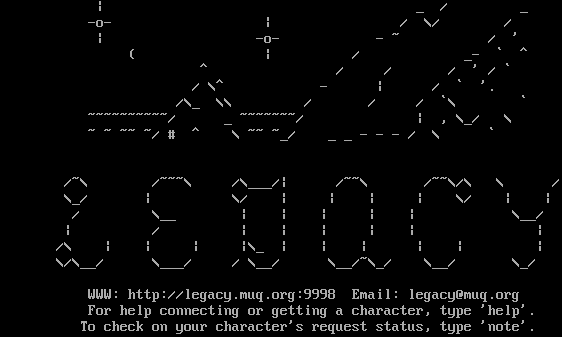 \| _ / _ -o- \| / \\/ / \| -o- - ~ / ' ( \| / _- \` ^ ^ / / / ' / \` / \\^ - \| / \` '. /\\_ \\\\ / / / \`\\ \` ~​~~~~~~~~~/ _ ~​~~~~~~/ \| , \\_/ \\ ~ ~ ~~ ~/ # ^ \\ ~~ ~_/ _ _ - - - / \\ \` /~\\ /~~~\\ /\\___/\| /~~\\ /~~\\/\\ \\ / \\_/ \| \\/ \| \| \| \| \\/ \| \| / \\__ \| \| \| \| \| \\__/ \| / \| \| \| \| \| \| /\\ \| \| \| \|\\_ \| \| \| \| \| \| \\/\\__/ \\___/ / \\__/ \\__/~\\_/ \\__/ \\_/ WWW: http://legacy.muq.org:9998 Email: legacy@muq.org For help connecting or getting a character, type 'help'. To check on your character's request status, type 'note'.