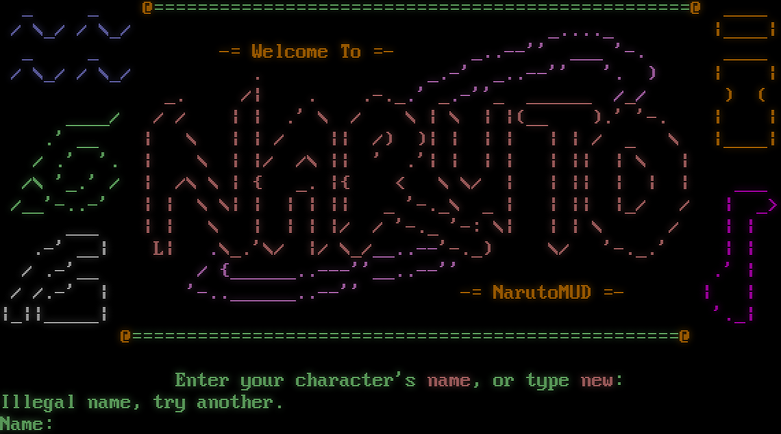 _ _ @=​================================================@ _​___ / \\_/ / \\_/ _​...._ \|_​___\| _ _ -= Welcome To =- _​..--'' ___ '-. _​___ / \\_/ / \\_/ . _.-' _​..--'' '. ) \| \| _. /\| . .​-._.' _.-''_ _​_____ /_/ ) ( _​___/ / / \| \| .' \\ / \\ \| \\ \| \|(__ ).' '-. \| \| .' __ \| \\ \| \| / \|\| /) )\| \| \| \| \| \| / _ \\ \|_​___\| / .' '. \| \\ \| \|/ /\\ \|\| ' .'\| \| \| \| \| \|\| \| \\ \| /\\ '_.' / \| /\\ \\ \| { _. \|{ < \\ \\/ \| \| \|\| \| \| \| ___ /__'-​..-' \| \| \\ \\\| \| \| \| \|\| _ '-._\\ _ \| \| \|\| \|_/ / \| _> ___ \| \| \\ \| \| \| \|/ / '-._ '-: \\\| \| \| \\ / \| \| .-' __\| L\| .\\_.'\\/ \|/ \\_/_​_..--'-._) \\/ '-​._.' \| \| / .-'__ / {_​_____..---''_​_..--'' .' \| / /.-' \| '-​..______..--'' -= NarutoMUD =- \| \| \|_\|\|_​____\| '._\| @=​=================================================@ Enter your character's name, or type new: Illegal name, try another. Name: