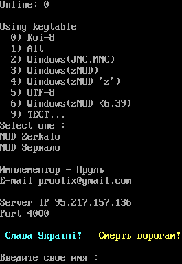 Online: 0 Using keytable 0) Koi-8 1) Alt 2) Windows(JMC,MMC) 3) Windows(zMUD) 4) Windows(zMUD 'z') 5) UTF-8 6) Windows(zMUD <6.39) 9) TECT... Select one : MUD Zerkalo MUD Зеркало Имплементор - Пруль E-mail proolix@gmail.com Server IP 95.217.157.136 Port 4000 Слава Україні! Смерть ворогам! Введите своё имя :