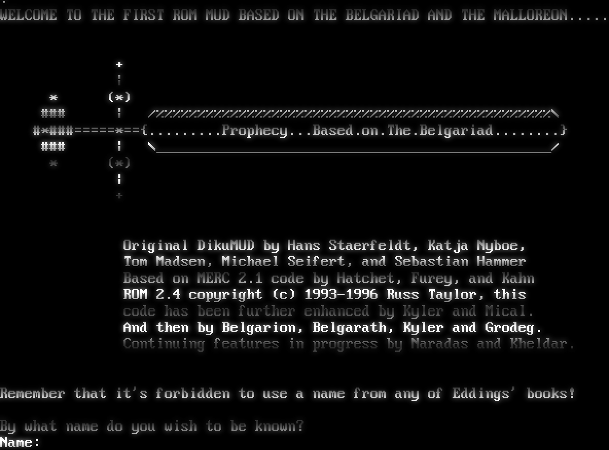 . WELCOME TO THE FIRST ROM MUD BASED ON THE BELGARIAD AND THE MALLOREON.​.... + \| \* (\*) ### \| /%%%%%%%%%%%%%%%%%%%%%%%%%%%%%%%%%%%%%%%%%%%%%%%%\\ #\*#​##=====\*=={.​........Prophecy...Based.on.The.Belgariad.​.......} ### \| \\_​_______________________________________________/ \* (\*) \| + Original DikuMUD by Hans Staerfeldt, Katja Nyboe, Tom Madsen, Michael Seifert, and Sebastian Hammer Based on MERC 2.1 code by Hatchet, Furey, and Kahn ROM 2.4 copyright (c) 1993-1996 Russ Taylor, this code has been further enhanced by Kyler and Mical. And then by Belgarion, Belgarath, Kyler and Grodeg. Continuing features in progress by Naradas and Kheldar. Remember that it's forbidden to use a name from any of Eddings' books! By what name do you wish to be known? Name:
