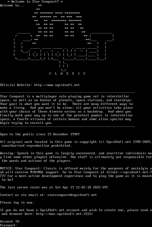 \* Welcome to Star Conquest! \* Welcome to... \*\* \*\* \*\* \*\*\*\*\*\*\* \*\*\*\* \*\*\*\*\*\*\*\* \*\* \*\*\*\*\*\* \*\* \*\* \*\*\* \*\*\* \*\* \*\* \*\*\*\*\*\*\*\* \*\*\*\*\*\*\* \*\* \*\* \*\* \*\* \*\* \*\* \*\* \*\* \*\* \*\* \*\* \*\* _​______ \*\* \*\* \*\* \*\* \*\* \*\* _​__________ / \\ \*\* \*\* \*\* \*\* \*\* \*\* \| \| / _​___/ \*\* \*\*\|___ ___\| \| / \*\* \*\* \| \| \| \| _​____ _​____ _​____ _ _ _​____ _​____\| \| \| \\___/ _ \| _ / _ \| \| \| \| -- \| _​___\| \| \\ \| \|_\| \| \| \| \| \|_\| \| \|_\| \| _​___\|_​___ \| \| \\_​_____\\_​____\|_\| \|_\\___ \|_​____\|_​____\|_​____\|___\| \| \|_ \| \| \| \\_/ C L A S S I C Official Website: http://www.squidsoft.net -​---------------------------------------------------------------------- Star Conquest is a multiplayer role-playing game set in interstellar space, as well as on dozens of planets, space stations, and starships. Your goal is what you want it to be. There are many different ways to make a living. And you won't be alone; all your activities take place with your choice of three diverse unions as a backdrop. And when you finally work your way up to one of the greatest powers in interstellar space, a fourth alliance of certain humans and some alien species may begin trying to recruit you. -​---------------------------------------------------------------------- Open to the public since 19 December 1998! All original work located in this game is copyright (c) SquidSoft.net 1998-2009, unauthorised reproduction prohibited. Warning: Speech in this game is largely uncensored, and sensitive individuals may find some other players offensive. The staff is ultimately not responsible for the words and actions of the players. NOTICE: Star Conquest: Classic is offered mainly for the purposes of nostalgia and will receive MINIMAL support. Go to Star Conquest at telnet://squidsoft.net:7777 for a more active development experience and to play the game as it is meant to be! The last server reset was at Sat Apr 19 12:02:10 2025 UTC Contact us via email at: starconquest@squidsoft.net Please log in now. If you do not have a SquidSoft.net account and wish to create one, please send a web browser here: http://moo.squidsoft.net:3333/ Account ID: Password: