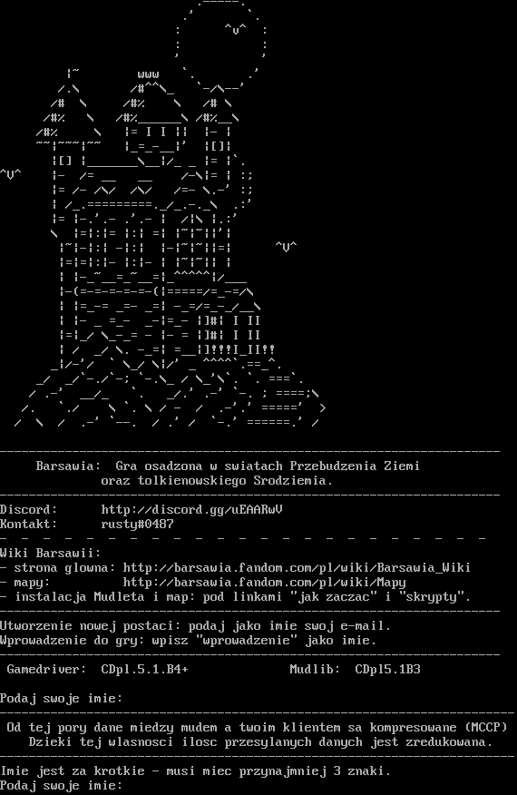 .​-----. .' \`. : ^v^ : : : ' ' \|~ www \`. .' /.\\ /#^^\\_ \`-/\\--' /# \\ /#% \\ /# \\ /#% \\ /#%_​_____\\ /#%__\\ /#% \\ \|= I I \|\| \|- \| ~~\|~~~\|~~ \|_​=_-__\|' \|[]\| \|[] \|_​______\\__\|/_ _ \|= \|\`. ^V^ \|- /= __ __ /-\\\|= \| :; \|= /- /\\/ /\\/ /=- \\.-' :; \| /_​.=========._/_​.-._\\ .:' \|= \|-.'.- .'.- \| /\|\\ \|.:' \\ \|=\|:\|= \|:\| =\| \|~\|~\|\|'\| \|~\|-\|:\| -\|:\| \|-\|~\|~\|\|=\| ^V^ \|=\|=\|:\|- \|:\|- \| \|~\|~\|\| \| \| \|-​_~__=_~__=\|_​^^^^^\|/___ \|-(=​-=-=-=-=-(\|=​====/=​_-=/\\ \| \|=​_-= _=- _=\| -_=/=​_-_/__\\ \| \|- _ =_- _-\|=_- \|]#\| I II \|=\|_/ \\_​-_= - \|- = \|]#\| I II \| / _/ \\. -_=\| =__\|]!!!I_II!! _\|/-'/ \` \\_/ \\\|/' _ ^​^^^\`.​==_^. _/ _/\`-./\`-; \`-.\\_ / \\_'\\\`. \`. ===\`. / .-' __/_ \`. _/.' .-' \`-. ; =​===;\\ /. \`./ \\ \`. \\ / - / .-'.' =​====' > / \\ / .-' \`--. / .' / \`-.' =​=====.' / -​-------------------------------------------------------------------- Barsawia: Gra osadzona w swiatach Przebudzenia Ziemi oraz tolkienowskiego Srodziemia. -​-------------------------------------------------------------------- Discord: http://discord.gg/uEAARwV Kontakt: rusty#0487 - - - - - - - - - - - - - - - - - - - - - - - Wiki Barsawii: - strona glowna: http://barsawia.fandom.com/pl/wiki/Barsawia_Wiki - mapy: http://barsawia.fandom.com/pl/wiki/Mapy - instalacja Mudleta i map: pod linkami "jak zaczac" i "skrypty". -​-------------------------------------------------------------------- Utworzenie nowej postaci: podaj jako imie swoj e-mail. Wprowadzenie do gry: wpisz "wprowadzenie" jako imie. -​-------------------------------------------------------------------- Gamedriver: CDpl.5.1.B4+ Mudlib: CDpl5.1B3 Podaj swoje imie: -​---------------------------------------------------------------------- Od tej pory dane miedzy mudem a twoim klientem sa kompresowane (MCCP) Dzieki tej wlasnosci ilosc przesylanych danych jest zredukowana. -​---------------------------------------------------------------------- Imie jest za krotkie - musi miec przynajmniej 3 znaki. Podaj swoje imie: