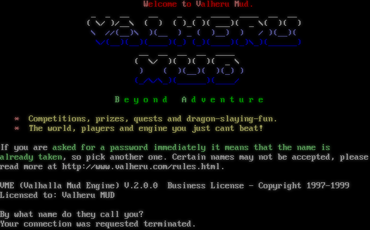 Welcome to Valheru Mud. _ _ __ __ _ _ _​___ _​___ __ __ ( \\/ )/__\\ ( ) ( )_( )( ___)( _ \\( )( ) \\ //(__)\\ )(__ ) _ ( )__) ) / )(__)( \\/(__)(__)(_​___)(_) (_)(_​___)(_)\\_)(_​_____) __ __ __ __ _​___ ( \\/ )( )( )( _ \\ ) ( )(__)( )(_) ) (_/\\/\\_)(_​_____)(_​___/ B e y o n d A d v e n t u r e \* Competitions, prizes, quests and dragon-slaying-fun. \* The world, players and engine you just cant beat! If you are asked for a password immediately it means that the name is already taken, so pick another one. Certain names may not be accepted, please read more at http://www.valheru.com/rules.html. VME (Valhalla Mud Engine) V.2.0.0 Business License - Copyright 1997-1999 Licensed to: Valheru MUD By what name do they call you? Your connection was requested terminated.