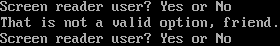 Screen reader user? Yes or No That is not a valid option, friend. Screen reader user? Yes or No