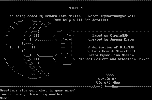 -​---------------------------------------------------------------------------- MULTI MUD ...is being coded by Benden [aka Martin S. Weber <Ephaeton@gmx.net>] __,-​---.__ _ (see help multi for details) '\\ /,' /,'(= ,'\\ /_/ / ~ _​___ /- /_ /--\| ,--' ,\`- - - - - - - - - - - - - - - - - - - - /- /__/ []\|_​______/ ,'- / Based on CircleMUD \| / \| /.​........\\ ,'-,-\| Created by Jeremy Elson \|] _\|,---, _​_________ \|--\| \| \| [] [__ \|] _​_________ \|--\| \| A derivative of DikuMUD \|] \|\`---' .​........ \|--\| \| by Hans Henrik Staerfeldt \| \\__\| \\_​______ / \`.-\`-\| Katja Nyboe, Tom Madsen \\- \\ _\\ []\| \\ \`.- \\ Michael Seifert and Sebastian Hammer \\- \\ _\\--\| \`-​-.____,- - - - - - - - - - - - - - - - - - - - \`./ \\_\\ \\ \`./ _​___\\\`. \\ _ \`-​.__ \\\\ \`_\`,(= \\\\\\\\ \`-​---'~ o,\*,(o o) 8(o o)(_)Ooo -​---------------------------------------------ooO--(_)---Ooo-​---------------- Greetings stranger, what is your name? Invalid name, please try another. Name: