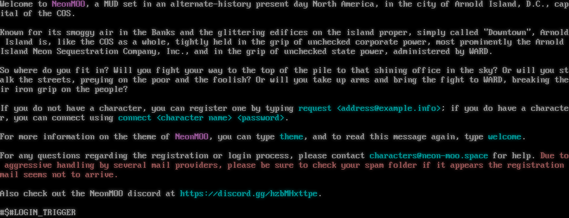 Welcome to NeonMOO, a MUD set in an alternate-history present day North America, in the city of Arnold Island, D.C., capital of the COS. Known for its smoggy air in the Banks and the glittering edifices on the island proper, simply called "Downtown", Arnold Island is, like the COS as a whole, tightly held in the grip of unchecked corporate power, most prominently the Arnold Island Neon Sequestration Company, Inc., and in the grip of unchecked state power, administered by WARD. So where do you fit in? Will you fight your way to the top of the pile to that shining office in the sky? Or will you stalk the streets, preying on the poor and the foolish? Or will you take up arms and bring the fight to WARD, breaking their iron grip on the people? If you do not have a character, you can register one by typing request <address@example.info>; if you do have a character, you can connect using connect <character name> <password>. For more information on the theme of NeonMOO, you can type theme, and to read this message again, type welcome. For any questions regarding the registration or login process, please contact characters@neon-moo.space for help. Due to aggressive handling by several mail providers, please be sure to check your spam folder if it appears the registration mail seems not to arrive. Also check out the NeonMOO discord at https://discord.gg/hzbMHxttpe. #$#LOGIN_TRIGGER