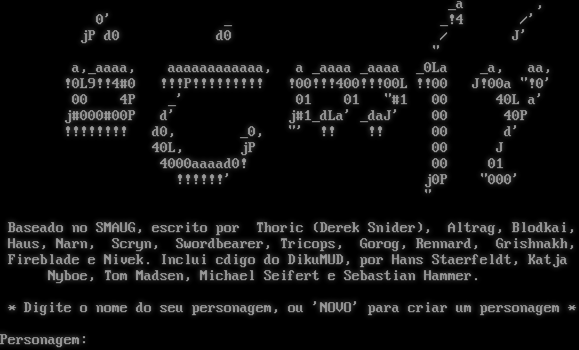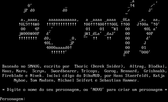 _a , 0' _ _!4 /' jP d0 d0 / J' " a,_aaaa, aaaaaaaaaaaa, a _aaaa _aaaa _0La _a, aa, !0L9!!4#0 !!!P!!!!!!!!! !00!!!400!!!00L !!00 J!00a "!0' 00 4P _' 01 01 "#1 00 40L a' j#000#00P d' j#1_dLa' _daJ' 00 40P !!!!!!!! d0, _0, "' !! !! 00 d' 40L, jP 00 J 4000aaaad0! 00 01 !!!!!!' j0P "000' " Baseado no SMAUG, escrito por Thoric (Derek Snider), Altrag, Blodkai, Haus, Narn, Scryn, Swordbearer, Tricops, Gorog, Rennard, Grishnakh, Fireblade e Nivek. Inclui cdigo do DikuMUD, por Hans Staerfeldt, Katja Nyboe, Tom Madsen, Michael Seifert e Sebastian Hammer. \* Digite o nome do seu personagem, ou 'NOVO' para criar um personagem \* Personagem: