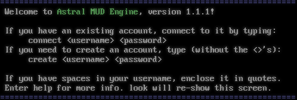 =​============================================================= Welcome to Astral MUD Engine, version 1.1.1! If you have an existing account, connect to it by typing: connect &lt;username&gt; &lt;password&gt; If you need to create an account, type (without the &lt;&gt;'s): create &lt;username&gt; &lt;password&gt; If you have spaces in your username, enclose it in quotes. Enter help for more info. look will re-show this screen. =​=============================================================