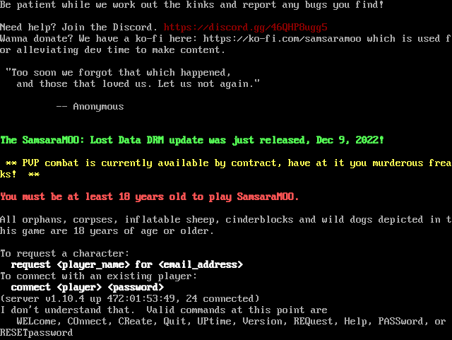 Be patient while we work out the kinks and report any bugs you find! Need help? Join the Discord. https://discord.gg/46QHP8ugg5 Wanna donate? We have a ko-fi here: https://ko-fi.com/samsaramoo which is used for alleviating dev time to make content. "Too soon we forgot that which happened, and those that loved us. Let us not again." -- Anonymous The SamsaraMOO: Lost Data DRM update was just released, Dec 9, 2022! \*\* PVP combat is currently available by contract, have at it you murderous freaks! \*\* You must be at least 18 years old to play SamsaraMOO. All orphans, corpses, inflatable sheep, cinderblocks and wild dogs depicted in this game are 18 years of age or older. To request a character: request <player_name> for <email_address> To connect with an existing player: connect <player> <password> (server v1.10.4 up 472:01:53:49, 24 connected) I don't understand that. Valid commands at this point are WELcome, COnnect, CReate, Quit, UPtime, Version, REQuest, Help, PASSword, or RESETpassword