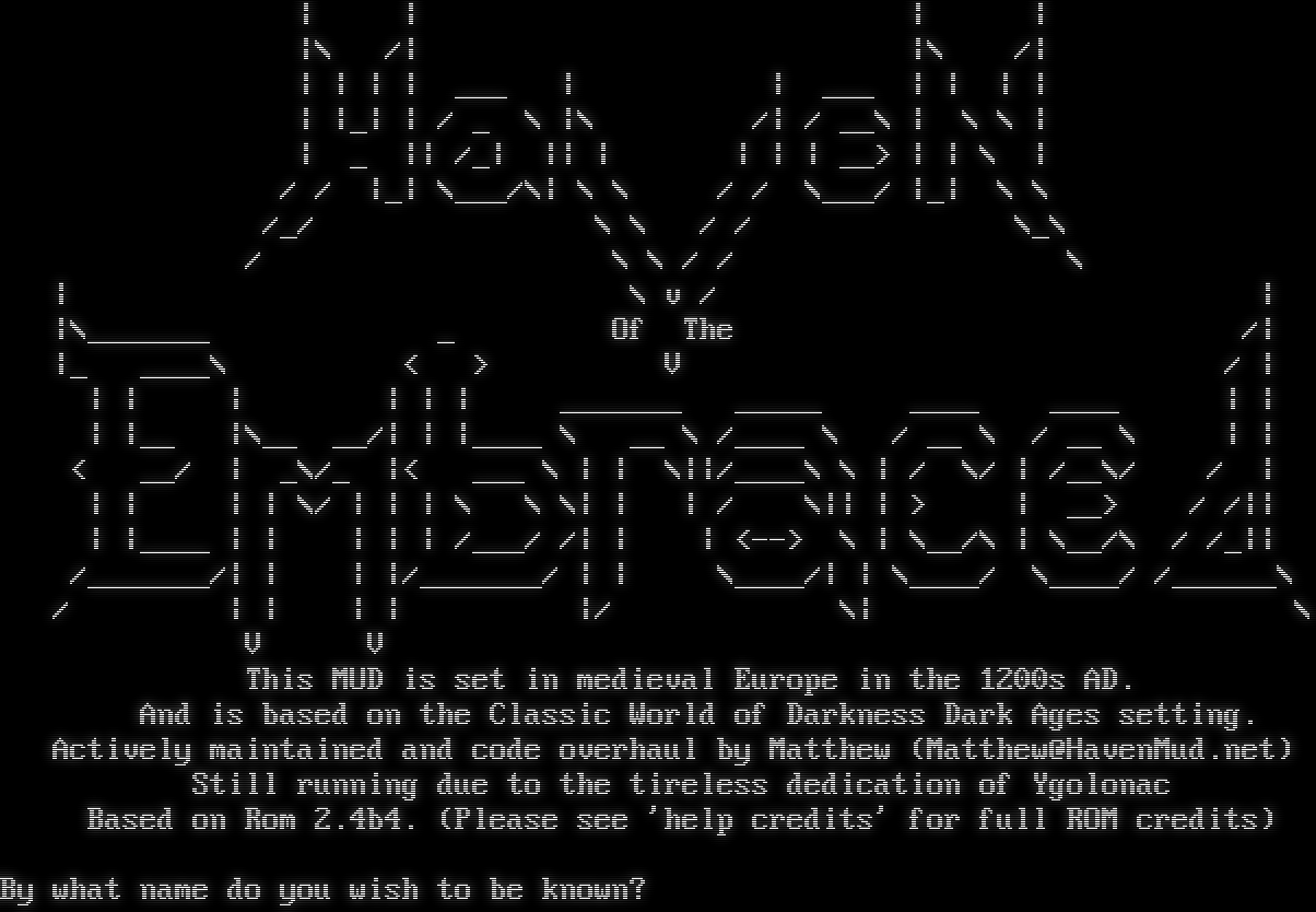 \| \| \| \| \|\\ /\| \|\\ /\| \| \| \| \| ___ \| \| ___ \| \| \| \| \| \|_\| \| / _ \\ \|\\ /\| / __\\ \| \\ \\ \| \| _ \|\| /_\| \|\| \| \| \| \| __> \| \| \\ \| / / \|_\| \\___/\\\| \\ \\ / / \\___/ \|_\| \\ \\ /_/ \\ \\ / / \\_\\ / \\ \\ / / \\ \| \\ v / \| \|\\_​______ _ Of The /\| \|_ _​___\\ < > V / \| \| \| \| \| \| \| _​______ _​____ _​___ _​___ \| \| \| \|__ \|\\__ __/\| \| \|_​___ \\ __ \\ /_​___ \\ / __ \\ / __ \\ \| \| < __/ \| _\\/_ \|< ___ \\ \| \| \\\|\|/_​___\\ \\ \| / \\/ \| /__\\/ / \| \| \| \| \| \\/ \| \| \| \\ \\ \\\| \| \| / \\\|\| \| > \| __> / /\|\| \| \|_​___ \| \| \| \| \| /___/ /\| \| \| <--> \\ \| \\__/\\ \| \\__/\\ / /_\|\| /_​______/\| \| \| \|/_​______/ \| \| \\_​___/\| \| \\_​___/ \\_​___/ /_​_____\\ / \| \| \| \| \|/ \\\| \\ V V This MUD is set in medieval Europe in the 1200s AD. And is based on the Classic World of Darkness Dark Ages setting. Actively maintained and code overhaul by Matthew (Matthew@HavenMud.net) Still running due to the tireless dedication of Ygolonac Based on Rom 2.4b4. (Please see 'help credits' for full ROM credits) By what name do you wish to be known?