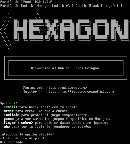 Versión de LPmud: DGD 1.7.5 Versión de Mudlib: Hexagon Mudlib v2.0 Castle Black [ español ] _​_____________ / _​___________ \\ / / \\ \\ / / ██╗ ██╗███████╗██╗ ██╗ █████╗ ██████╗ ██████╗ ███╗ ██╗ / / ██║ ██║██╔════╝╚██╗██╔╝██╔══██╗██╔════╝ ██╔═══██╗████╗ ██║ / / ███████║█████╗\\ \\╚███╔╝ ███████║██║ ███╗██║ ██║██╔██╗ ██║ \\ \\ ██╔══██║██╔══╝/ /██╔██╗ ██╔══██║██║ ██║██║ ██║██║╚██╗██║ \\ \\ ██║ ██║███████╗██╔╝ ██╗██║ ██║╚██████╔╝╚██████╔╝██║ ╚████║ \\ \\ ╚═╝ ╚═╝╚══════╝╚═╝ ╚═╝╚═╝ ╚═╝ ╚═════╝ ╚═════╝ ╚═╝ ╚═══╝ \\ \\_​___________/ / \\_​_____________/ ╔══════════════════════════════════════════════════════════════╗ ║ ╔══════════════════════════════════════════════════════════╗ ║ ║ ║ ║ ║ ║ ║ Bienvenido al Hub de Juegos Hexagon ║ ║ ║ ║ ║ ║ ║ ╚══════════════════════════════════════════════════════════╝ ║ ╚══════════════════════════════════════════════════════════════╝ Página web: https://maldorne.org/ Twitter: https://twitter.com/houseofmaldorne Opciones: <email> para hacer login con tu cuenta. crear para crear una nueva cuenta. invitado para probar el juego temporalmente. games para ver todos los juegos disponibles en Hexagon. finger <nombre> para obtener datos sobre otro jugador. who para ver la lista de jugadores conectados. Introduce la opción elegida: ¡Vuelve dentro de poco! Desconectado.