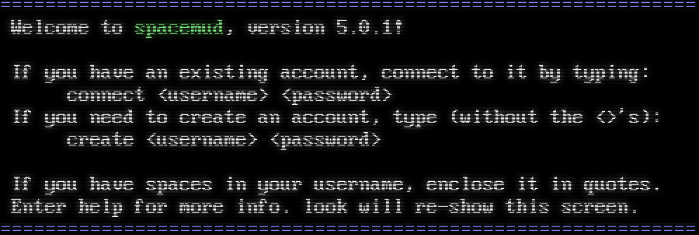 =​============================================================= Welcome to spacemud, version 5.0.1! If you have an existing account, connect to it by typing: connect &lt;username&gt; &lt;password&gt; If you need to create an account, type (without the &lt;&gt;'s): create &lt;username&gt; &lt;password&gt; If you have spaces in your username, enclose it in quotes. Enter help for more info. look will re-show this screen. =​=============================================================