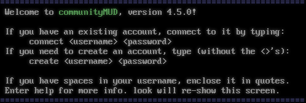 =​============================================================= Welcome to communityMUD, version 4.5.0! If you have an existing account, connect to it by typing: connect &lt;username&gt; &lt;password&gt; If you need to create an account, type (without the &lt;&gt;'s): create &lt;username&gt; &lt;password&gt; If you have spaces in your username, enclose it in quotes. Enter help for more info. look will re-show this screen. =​=============================================================