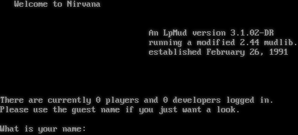 Welcome to Nirvana An LpMud version 3.1.02-DR running a modified 2.44 mudlib. established February 26, 1991 There are currently 0 players and 0 developers logged in. Please use the guest name if you just want a look. What is your name: