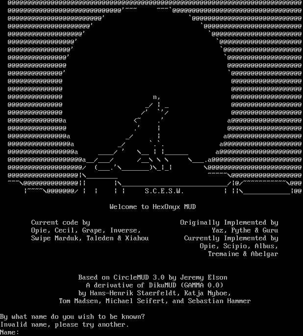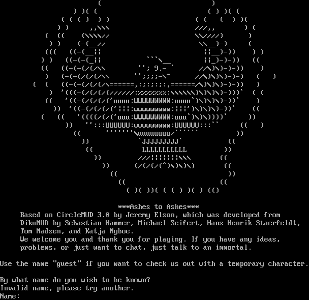 ( ) ) )( ( ( ) )( ( ( ( ( ) ) ) ( ( ( ) )( ) ) ,,\\\\\\ ///,, ) ( ( (( (\\\\\\\\// \\\\////) ) ) ) (-(__// \\\\__)-) ( ((( ((-(__\|\| \|\|__)-)) ) ) ) ) ((-(-(_\|\| \`\`\`\\__ \|\|_)-)-)) (( (( ((-(-(/(/\\\\ ''; 9.- \` //\\)\\)-)-)) ) ) (-(-(/(/(/\\\\ '';;;;-\\~ //\\)\\)\\)-)-) ( ) ( ( ((-(-(/(/(/\\=​=====,:;:;:;:,=​=====/\\)\\)\\)-)-)) ) ) '(((-(/(/(/(//////:%%%%%%%:\\\\\\\\\\\\)\\)\\)\\)-)))\` ( ( (( '((-(/(/(/('uuuu:WWWWWWWWW:uuuu\`)\\)\\)\\)-))\` ) )) '((-(/(/(/('\|\|\|:wwwwwwwww:\|\|\|')\\)\\)\\)-))\` (( ( (( '((((/(/('uuu:WWWWWWWWW:uuu\`)\\)\\))))\` )) )) '':::UUUUUU:wwwwwwwww:UUUUUU:::\`\` (( ) (( '''''''\\uuuuuuuu/\`\`\`\`\`\` )) )) \`JJJJJJJJJ\` (( (( LLLLLLLLLLL )) )) ///\|\|\|\|\|\|\|\\\\\\ (( )) (/(/(/(^)\\)\\)\\) (( (( )) (( (( ( )( ))( ( ( ) )( ) (() \*\*\*Ashes to Ashes\*\*\* Based on CircleMUD 3.0 by Jeremy Elson, which was developed from DikuMUD by Sebastian Hammer, Michael Seifert, Hans Henrik Staerfeldt, Tom Madsen, and Katja Nyboe. We welcome you and thank you for playing. If you have any ideas, problems, or just want to chat, just talk to an immortal. Use the name "guest" if you want to check us out with a temporary character. By what name do you wish to be known? Invalid name, please try another. Name: