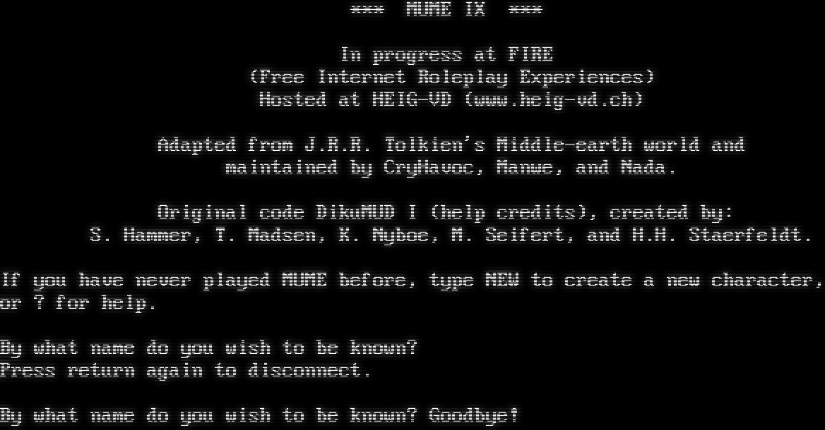 \*\*\* MUME IX \*\*\* In progress at FIRE (Free Internet Roleplay Experiences) Hosted at HEIG-VD (www.heig-vd.ch) Adapted from J.R.R. Tolkien's Middle-earth world and maintained by CryHavoc, Manwe, and Nada. Original code DikuMUD I (help credits), created by: S. Hammer, T. Madsen, K. Nyboe, M. Seifert, and H.H. Staerfeldt. If you have never played MUME before, type NEW to create a new character, or ? for help. By what name do you wish to be known? Press return again to disconnect. By what name do you wish to be known? Goodbye!