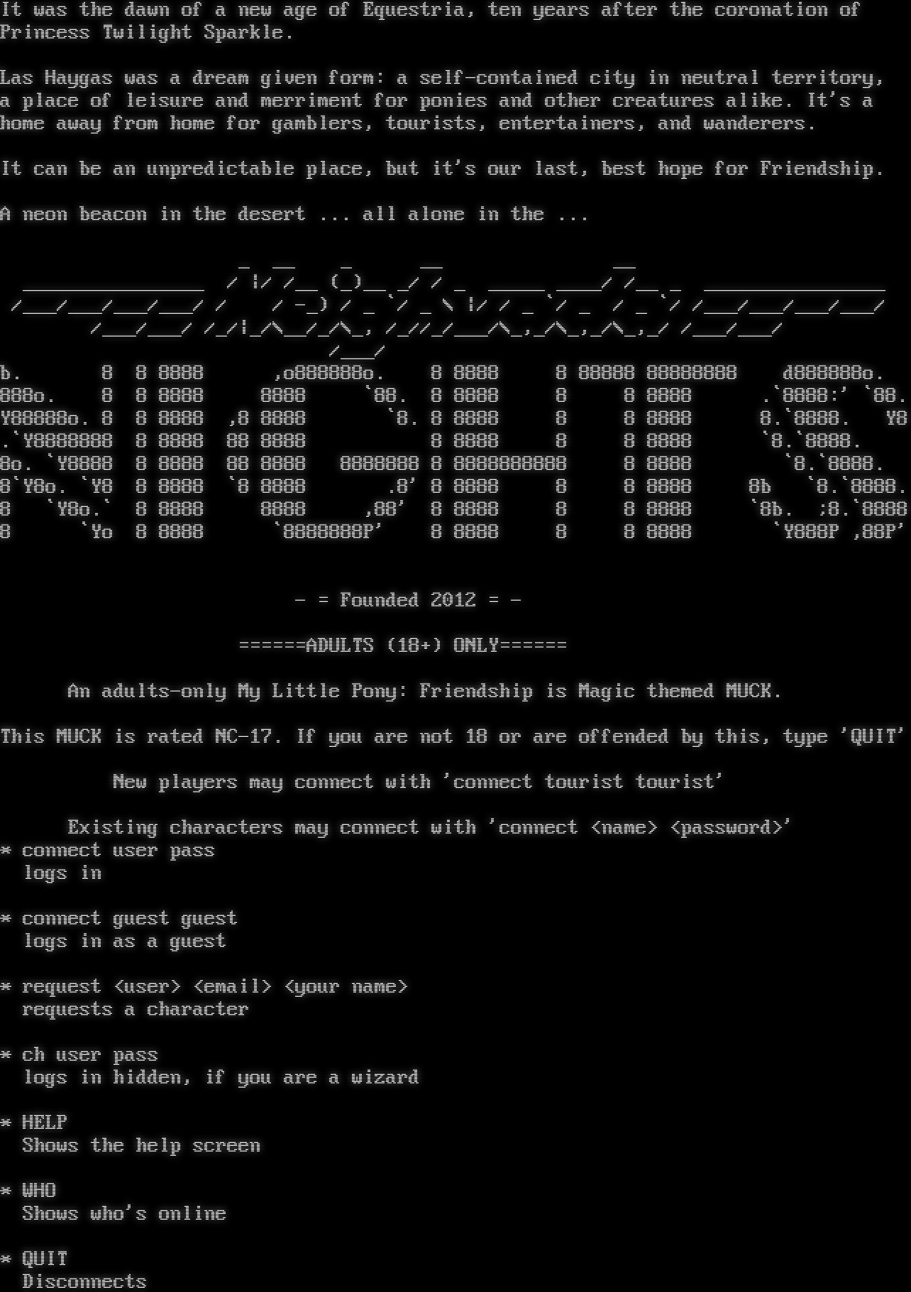 It was the dawn of a new age of Equestria, ten years after the coronation of Princess Twilight Sparkle. Las Haygas was a dream given form: a self-contained city in neutral territory, a place of leisure and merriment for ponies and other creatures alike. It's a home away from home for gamblers, tourists, entertainers, and wanderers. It can be an unpredictable place, but it's our last, best hope for Friendship. A neon beacon in the desert ... all alone in the ... _ __ _ __ __ _​_______________ / \|/ /__ (_)__ _/ / _ _​____ _​___/ /__ _ _​_______________ /___/___/___/___/ / / -_) / _ \`/ _ \\ \|/ / _ \`/ _ / _ \`/ /___/___/___/___/ /___/___/ /_/\|_/\\__/_/\\_, /_//_/___/\\_,_/\\_,_/\\_,_/ /___/___/ /___/ b. 8 8 8888 ,o888888o. 8 8888 8 88888 88888888 d888888o. 888o. 8 8 8888 8888 \`88. 8 8888 8 8 8888 .\`8888:' \`88. Y88888o. 8 8 8888 ,8 8888 \`8. 8 8888 8 8 8888 8.\`8888. Y8 .\`Y8888888 8 8888 88 8888 8 8888 8 8 8888 \`8.\`8888. 8o. \`Y8888 8 8888 88 8888 8888888 8 8888888888 8 8888 \`8.\`8888. 8\`Y8o. \`Y8 8 8888 \`8 8888 .8' 8 8888 8 8 8888 8b \`8.\`8888. 8 \`Y8o.\` 8 8888 8888 ,88' 8 8888 8 8 8888 \`8b. ;8.\`8888 8 \`Yo 8 8888 \`8888888P' 8 8888 8 8 8888 \`Y888P ,88P' - = Founded 2012 = - =​=====ADULTS (18+) ONLY=​===== An adults-only My Little Pony: Friendship is Magic themed MUCK. This MUCK is rated NC-17. If you are not 18 or are offended by this, type 'QUIT' New players may connect with 'connect tourist tourist' Existing characters may connect with 'connect <name> <password>' \* connect user pass logs in \* connect guest guest logs in as a guest \* request <user> <email> <your name> requests a character \* ch user pass logs in hidden, if you are a wizard \* HELP Shows the help screen \* WHO Shows who's online \* QUIT Disconnects