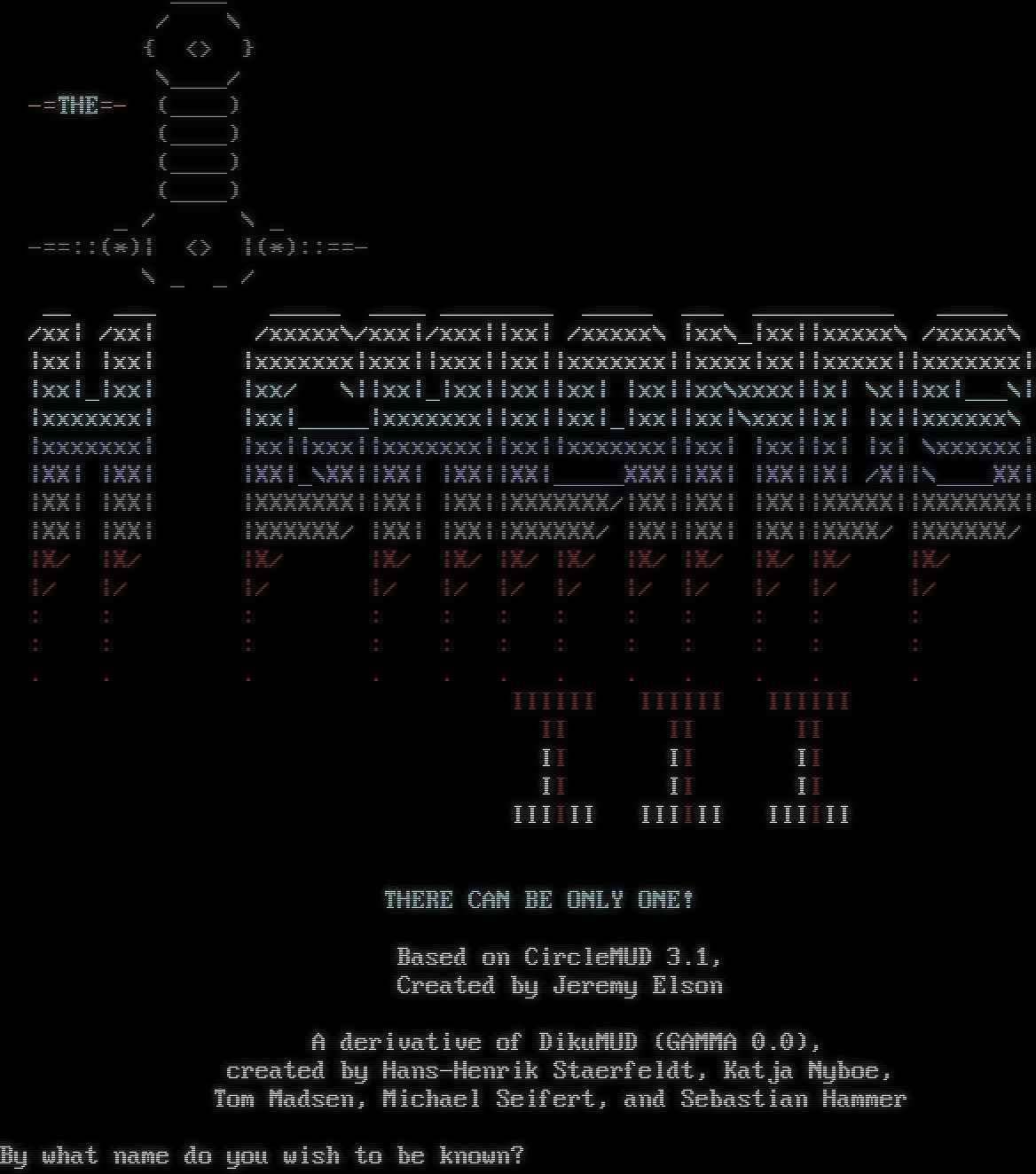 _​___ / \\ { <> } \\_​___/ -=THE=- (_​___) (_​___) (_​___) (_​___) _ / \\ _ -==::(\*)\| <> \|(\*)::==- \\ _ _ / __ ___\|@\|\|#\| _​____ _​___ _​_______ _​____ ___ _​_________ _​____ /xx\| /xx\|\| \| /xxxxx\\/xxx\|/xxx\|\|xx\| /xxxxx\\ \|xx\\_\|xx\|\|xxxxx\\ /xxxxx\\ \|xx\| \|xx\|\|@\|\|@\|\|xxxxxxx\|xxx\|\|xxx\|\|xx\|\|xxxxxxx\|\|xxxx\|xx\|\|xxxxx\|\|xxxxxxx\| \|xx\|_\|xx\|\|\|$\|$\|\|xx/ \\\|\|xx\|_\|xx\|\|xx\|\|xx\| \|xx\|\|xx\\xxxx\|\|x\| \\x\|\|xx\|___\\\| \|xxxxxxx\|\|%\|\|%\|\|xx\|_​____\|xxxxxxx\|\|xx\|\|xx\|_\|xx\|\|xx\|\\xxx\|\|x\| \|x\|\|xxxxxx\\ \|xxxxxxx\|\|\*\|\|\*\|\|xx\|\|xxx\|\|xxxxxxx\|\|xx\|\|xxxxxxx\|\|xx\| \|xx\|\|x\| \|x\| \\xxxxxx\| \|XX\| \|XX\|\|#\|\|#\|\|XX\|_\\XX\|\|XX\| \|XX\|\|XX\|_​____XXX\|\|XX\| \|XX\|\|X\| /X\|\|\\_​___XX\| \|XX\| \|XX\|\|_ _\|\|XXXXXXX\|\|XX\| \|XX\|\|XXXXXXX/\|XX\|\|XX\| \|XX\|\|XXXXX\|\|XXXXXXX\| \|XX\| \|XX\|\|%\|\|%\|\|XXXXXX/ \|XX\| \|XX\|\|XXXXXX/ \|XX\|\|XX\| \|XX\|\|XXXX/ \|XXXXXX/ \|X/ \|X/ \|\*\|\|\*\|\|X/ \|X/ \|X/ \|X/ \|X/ \|X/ \|X/ \|X/ \|X/ \|X/ \|/ \|/ \|@\|\|@\|\|/ \|/ \|/ \|/ \|/ \|/ \|/ \|/ \|/ \|/ : : \|$\|\|$\|: : : : : : : : : : : : \|%\|\|%\|: : : : : : : : : : . . \|\*\|\|\*\|. . . . . . . . . . \|@\|\|@\| IIIIII IIIIII IIIIII \|$\|\|$\| II II II \\ \|\| / II II II \\\\// II II II \\/ IIIIII IIIIII IIIIII THERE CAN BE ONLY ONE! Based on CircleMUD 3.1, Created by Jeremy Elson A derivative of DikuMUD (GAMMA 0.0), created by Hans-Henrik Staerfeldt, Katja Nyboe, Tom Madsen, Michael Seifert, and Sebastian Hammer By what name do you wish to be known?