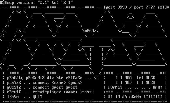 #$#mcp version: "2.1" to: "2.1" -​---====----====----====----====----====----[port 9999 / port 7777 ssl]= / \\/ \\ _​___ _​_______ _​___ / \\ _ _​___ / \\ / \\ _​___/ \\ / \\ /_\\ / \\ /: / \\ \\ / \\ /: \\ _​____ / \\ /: / /_​____> \\/ /_​____> /: \\ / \\/ /_​____> /: /\\ / \\ / \\nPzO/: \\/___ / \\ /: / /_​___________\\/_​___________\\__/_​______________\\_/_​___________\\ \\_​___/ \\/ \\_​___/ ___ __ _​___/ \\_​___ _​_______ _​___ / \\ / \\ / \\ / / _​____ _​____ \\ \\ _​___/ \\ /: \\ / \\/ \\/ \\/\\ \| \| /\\/ \\ \\ / \\ /: \\/ _ \\ / _​_____\\ \| \| / /_​____> \\/ _​_____\\ /: / \\/\\/_​______ \\\| \|/ \\ /_​______ \\ /: __ __/_​__________\\/_​___________\| \|_​___________\\/_​___________\\ \\__/ \\__/ \\__/ \\__/ \\__/ \\ / +​--====----====----====----====----===\\ /-​+===----====----====----==+ \| pRoUdLy pReSeNtZ dIz hLm rElEaZe ... \\/ \| [ ] MOO [x] MUCK \| \| pLaYaZ ... connect <name> <pass> \| [ ] MUD [ ] MUSH \| \| gUeStZ ... connect guest guest \| fOrMaT .​.......... RAR! \| \| cReAtE ... createplayer <name> <pass> +​===----====----====----==+ \| lEaVe ... QUIT \| #1 iN dA sKeNe !!!!!!!! \| +​--====----====----====----====----====----+===----====----====----==+