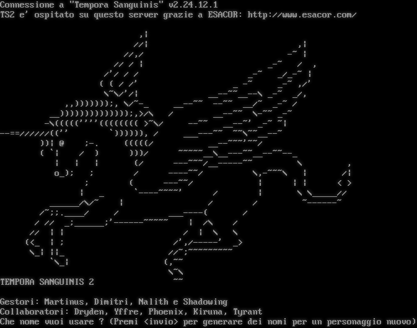 Connessione a "Tempora Sanguinis" v2.24.12.1 TS2 e' ospitato su questo server grazie a ESACOR: http://www.esacor.com/ ,\| //\| ,\| //,/ -~ \| // / \| _-~ / , /'/ / / _-~ _/_-~ \| ( ( / /' _ -~ _-~ ,/' \\~\\/'/\| _​_--~~__--\\ _-~ _/, ,,)))))));, \\/~-_ _​_--~~ -​-~~ __/~ _-~ / __))))))))))))));,>/\\ / _​_--~~ \\-~~ _-~ -\\(((((''''(((((((( >~\\/ -​-~~ _​_--~' _-~ ~\| -​-==//////(('' \`)))))), / _​__---~~ ~~\\~​~__--~ ))\| @ ;-. (((((/ _​_--~~~'~~/ ( \`\| / ) )))/ ~​~~~~__\\_​_---~~__--~~--_ \| \| \| (/ -​--~~~/_​_-----~~ \\ , o_); ; / -​---~~/ \\,-​~~~\\ \| /\| ; ( -​--~~/ \| \| \| < > \| _ \`-​---~~~~' / \| \\ \\_​____// _​_____/\\/~ \| / / ~​------~ /~;;.​____/ / _​__----( / / // _;_​_____;'-​-----~~~~~ \| /\\ / // \| \| / \| \\ \\ (<_ \| ; /',/-​----' _> \\_\| \|\|_ //~;~​~~~~~~~~ \`\\_\| (,~~ \\~\\ TEMPORA SANGUINIS 2 ~~ Gestori: Martinus, Dimitri, Nalith e Shadowing Collaboratori: Dryden, Yffre, Phoenix, Kiruna, Tyrant Che nome vuoi usare ? (Premi <invio> per generare dei nomi per un personaggio nuovo)<!-- Set up MXP elements --><!ELEMENT Ex '<send>' FLAG='RoomExit'><!ELEMENT Rname FLAG='RoomName'><!ELEMENT Rdesc FLAG='RoomDesc'><!ELEMENT Hp FLAG="Set TSHp"><!ELEMENT Lag FLAG="Set TSLag"><!ELEMENT HpReg FLAG="Set TSHpRegen"><!ELEMENT MaxHp FLAG="Set TSMaxHp"><!ELEMENT Mn FLAG="Set TSMana"><!ELEMENT MnReg FLAG="Set TSManaRegen"><!ELEMENT MaxMn FLAG="Set TSMaxMana"><!ELEMENT Mv FLAG="Set TSMov"><!ELEMENT MvReg FLAG="Set TSMovRegen"><!ELEMENT MaxMv FLAG="Set TSMaxMov"><!ELEMENT Gold FLAG="Set TSGold"><!ELEMENT Bank FLAG="Set TSBank"><!ELEMENT Align FLAG="Set TSAlign"><!ELEMENT Xp FLAG="Set TSXp"><!ELEMENT XptoLev FLAG="Set TSXptoLevel"><!ELEMENT MobCond FLAG="Set TSMobCond"><!ELEMENT PcCond FLAG="Set TSTankCond"><!ELEMENT Tank FLAG="Set TSTank"><!ELEMENT Mob FLAG="Set TSMob"><!ELEMENT PQ FLAG="Set TSSigDivini"><!ELEMENT TR FLAG="Set TSSigTerra"><!ELEMENT AR FLAG="Set TSSigAria"><!ELEMENT AC FLAG="Set TSSigAcqua"><!ELEMENT FU FLAG="Set TSSigFuoco"><!ELEMENT QP FLAG="Set TSMedaglieValore"><!ELEMENT STARTPROMPT EMPTY><!ELEMENT ENDPROMPT EMPTY><!ELEMENT TSIMG EMPTY><!ATTLIST TSIMG url w h align><!ELEMENT Get "<send href='get &name;' hint='Prendi &name;'>" ATT='name'><!ELEMENT Buy "<send href='buy &name;\|exa &name;' hint='Compra o esamina\|Compra &name\|Esamina &name;'>" ATT='name'> Nomi possibili da utilizzare: Uledrigord Sararii Talobaryn Glelin Mefax Sifey Zalind Kekgul Bleollyn Cocla Che nome vuoi usare ? (Premi &lt;invio&gt; per generarne altri)