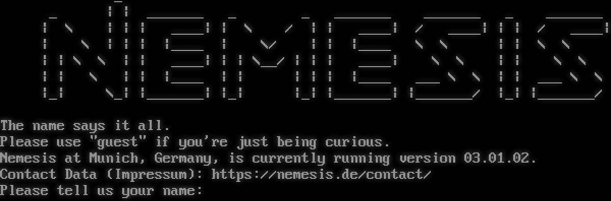 _ _ \| \| _​______ _ _ _​______ _​______ _ _​______ \| \\ \| \| \| _​___\| \| \\ / \| \| _​___\| / _​___\| \| \| / _​___\| \| \\ \| \| \| \|_​___ \| \\/ \| \| \|_​___ \\ \\ \| \| \\ \\ \| \| \\ \\ \| \| _​___\| \| \| \\__/ \| \| \| _​___\| \\ \\ \| \| \\ \\ \| \| \\ \| \| \|_​___ \| \| \| \| \| \|_​___ ___ \\ \\ \| \| ___ \\ \\ \|_\| \\_\| \|_​______\| \|_\| \|_\| \|_​______\| \|_​______/ \|_\| \|_​______/ The name says it all. Please use "guest" if you're just being curious. Nemesis at Munich, Germany, is currently running version 03.01.02. Contact Data (Impressum): https://nemesis.de/contact/ Please tell us your name: