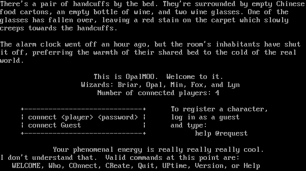 There's a pair of handcuffs by the bed. They're surrounded by empty Chinese food cartons, an empty bottle of wine, and two wine glasses. One of the glasses has fallen over, leaving a red stain on the carpet which slowly creeps towards the handcuffs. The alarm clock went off an hour ago, but the room's inhabitants have shut it off, preferring the warmth of their shared bed to the cold of the real world. This is OpalMOO. Welcome to it. Wizards: Briar, Opal, Min, Fox, and Lyn Number of connected players: 4 +​-----------------------------+ To register a character, \| connect <player> <password> \| log in as a guest \| connect Guest \| and type: +​-----------------------------+ help @request Your phenomenal energy is really really really cool. I don't understand that. Valid commands at this point are: WELCOME, Who, COnnect, CReate, Quit, UPtime, Version, or Help