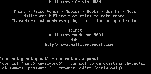 Multiverse Crisis MUSH Anime \* Video Games \* Movies \* Books \* Sci-Fi \* More Multitheme MUSHing that tries to make sense. Characters and membership by invitation or application Telnet multiversemush.com:5001 Web http://www.multiversemush.com =​=============================================================== 'connect guest guest' - connect as a guest. 'connect <name> <password>' - connect to an existing character. 'ch <name> <password>' - connect hidden (admin only). =​===============================================================
