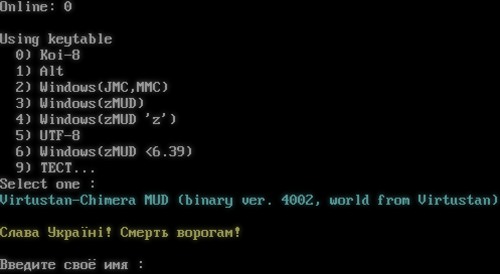 Online: 0 Using keytable 0) Koi-8 1) Alt 2) Windows(JMC,MMC) 3) Windows(zMUD) 4) Windows(zMUD 'z') 5) UTF-8 6) Windows(zMUD <6.39) 9) TECT... Select one : Virtustan-Chimera MUD (binary ver. 4002, world from Virtustan) Слава Україні! Смерть ворогам! Введите своё имя :