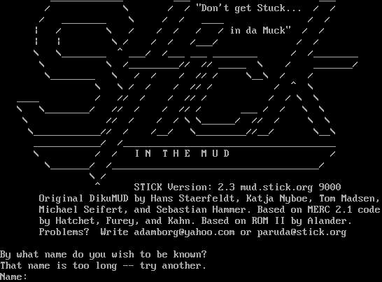 _​____________ ___ ___ / \\ / / "Don't get Stuck... / / / _​_______ \\ / / _​___ / / \| / \\ / / / / / in da Muck" / / \| \| \\ / / / /___/ / / \\ \\_​_______ ^ ___/ /___ ___ _​_______ / /_​_______ \\ \\ /_​________// // _​____ \\ / _​______/ \\_​_______ \\ / / / // / \\__\\ / / \\ \\ / / / // / / ^ \\ _​___ / // / / // / / / \\ \\ \\ \\_​_______/ // / / // / ___ / / \\ \\ \\ // / / / \\ \\_​_____/ // / \\ \\ \\_​___________// / /__/ \\_​________//__/ \\__\\ _​___________/ /_​_____________________________________ \\ / / I N T H E M U D / \\_​______/ /_​____________________________________/ \\ / ^ STICK Version: 2.3 mud.stick.org 9000 Original DikuMUD by Hans Staerfeldt, Katja Nyboe, Tom Madsen, Michael Seifert, and Sebastian Hammer. Based on MERC 2.1 code by Hatchet, Furey, and Kahn. Based on ROM II by Alander. Problems? Write adamborg@yahoo.com or paruda@stick.org By what name do you wish to be known? That name is too long -- try another. Name: