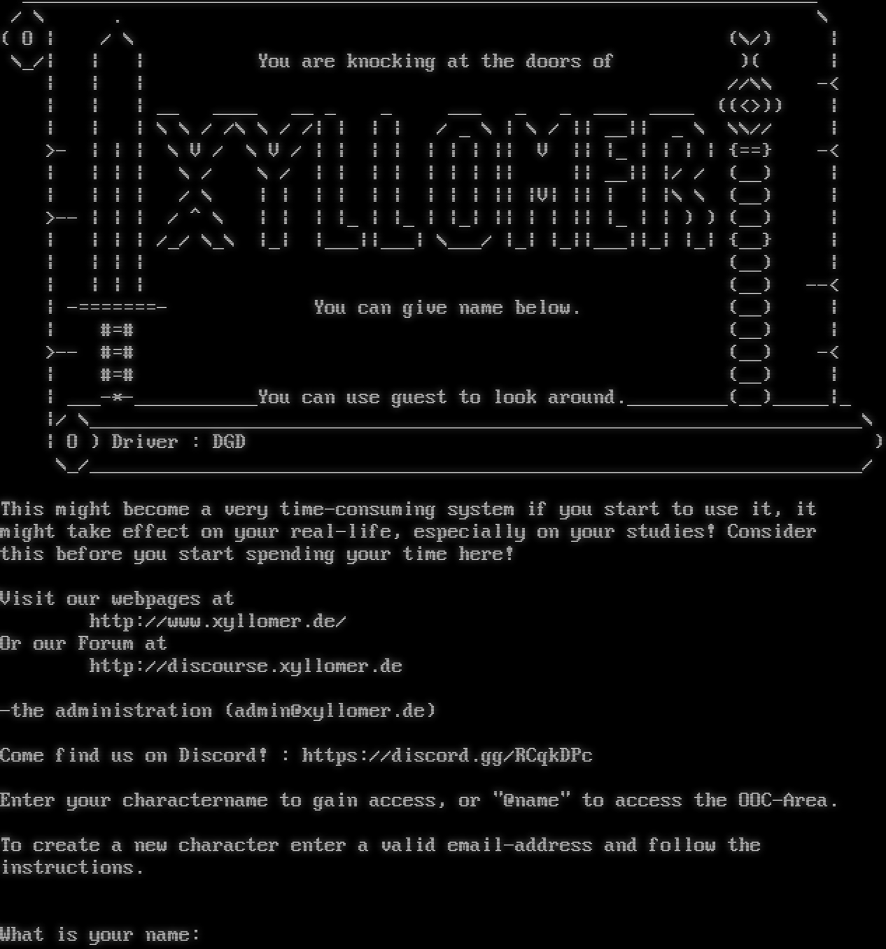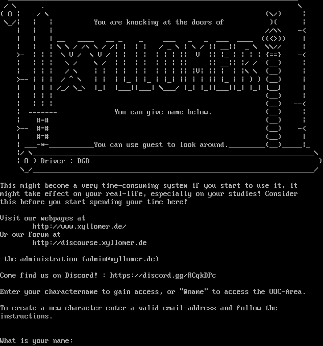 _​______________________________________________________________________ / \\ . \\ ( O \| / \\ (\\/) \| \\_/\| \| \| You are knocking at the doors of )( \| \| \| \| //\\\\ -< \| \| \| __ _​___ __ _ _ ___ _ _ ___ _​___ ((<>)) \| \| \| \| \\ \\ / /\\ \\ / /\| \| \| \| / _ \\ \| \\ / \|\| __\|\| _ \\ \\\\// \| >- \| \| \| \\ V / \\ V / \| \| \| \| \| \| \| \|\| V \|\| \|_ \| \| \| \| {==} -< \| \| \| \| \\ / \\ / \| \| \| \| \| \| \| \|\| \|\| __\|\| \|/ / (__) \| \| \| \| \| / \\ \| \| \| \| \| \| \| \| \| \|\| \|V\| \|\| \| \| \|\\ \\ (__) \| >-- \| \| \| / ^ \\ \| \| \| \|_ \| \|_ \| \|_\| \|\| \| \| \|\| \|_ \| \| ) ) (__) \| \| \| \| \| /_/ \\_\\ \|_\| \|___\|\|___\| \\___/ \|_\| \|_\|\|___\|\|_\| \|_\| {__} \| \| \| \| \| (__) \| \| \| \| \| (__) --< \| -​=======- You can give name below. (__) \| \| #=# (__) \| >-- #=# (__) -< \| #=# (__) \| \| _​__-\*-​___________You can use guest to look around.​_________(__)_​____\|_ \|/ \\_​____________________________________________________________________\\ \| O ) Driver : DGD ) \\_/_​____________________________________________________________________/ This might become a very time-consuming system if you start to use it, it might take effect on your real-life, especially on your studies! Consider this before you start spending your time here! Visit our webpages at http://www.xyllomer.de/ Or our Forum at http://discourse.xyllomer.de -the administration (admin@xyllomer.de) Come find us on Discord! : https://discord.gg/RCqkDPc Enter your charactername to gain access, or "@name" to access the OOC-Area. To create a new character enter a valid email-address and follow the instructions. What is your name: