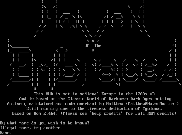 \| \| \| \| \|\\ /\| \|\\ /\| \| \| \| \| ___ \| \| ___ \| \| \| \| \| \|_\| \| / _ \\ \|\\ /\| / __\\ \| \\ \\ \| \| _ \|\| /_\| \|\| \| \| \| \| __> \| \| \\ \| / / \|_\| \\___/\\\| \\ \\ / / \\___/ \|_\| \\ \\ /_/ \\ \\ / / \\_\\ / \\ \\ / / \\ \| \\ v / \| \|\\_​______ _ Of The /\| \|_ _​___\\ < > V / \| \| \| \| \| \| \| _​______ _​____ _​___ _​___ \| \| \| \|__ \|\\__ __/\| \| \|_​___ \\ __ \\ /_​___ \\ / __ \\ / __ \\ \| \| < __/ \| _\\/_ \|< ___ \\ \| \| \\\|\|/_​___\\ \\ \| / \\/ \| /__\\/ / \| \| \| \| \| \\/ \| \| \| \\ \\ \\\| \| \| / \\\|\| \| > \| __> / /\|\| \| \|_​___ \| \| \| \| \| /___/ /\| \| \| <--> \\ \| \\__/\\ \| \\__/\\ / /_\|\| /_​______/\| \| \| \|/_​______/ \| \| \\_​___/\| \| \\_​___/ \\_​___/ /_​_____\\ / \| \| \| \| \|/ \\\| \\ V V This MUD is set in medieval Europe in the 1200s AD. And is based on the Classic World of Darkness Dark Ages setting. Actively maintained and code overhaul by Matthew (Matthew@HavenMud.net) Still running due to the tireless dedication of Ygolonac Based on Rom 2.4b4. (Please see 'help credits' for full ROM credits) By what name do you wish to be known? Illegal name, try another. Name: