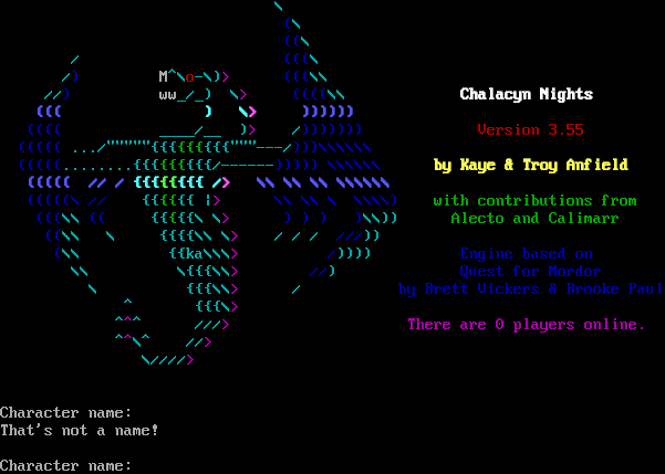 \\ ( (\\ / ) ((\\ / ( / (((\\ /) \\(_ M^\\o-\\)> (((\\\\ //) ww_/_) \\> ((((\\\\ Chalacyn Nights ((( ) \\> )))))) (((( _​___/__ )> /))))))) Version 3.55 ((((( .../"​""""{{{{{{{{{"​""---/)))\\\\\\\\\\\\ (((((.​.......{{{{{{{{{/-​-----))))) \\\\\\\\\\\\ by Kaye & Troy Anfield ((((( // / {{{{{{{{ /> \\\\ \\\\ \\\\ \\\\\\\\\\\\ (((((\\ // {{{{{{ \|> \\\\ \\\\ \\ \\\\\\\\) with contributions from (((\\\\ (( {{{{{\\ \\> ) ) ) )\\\\)) Alecto and Calimarr ((\\\\ \\ {{{{\\\\ \\> / / / ///)) (\\\\ {{ka\\\\\\> /)))) Engine based on \\\\ \\{{{\\\\> //) Quest for Mordor \\ {{{\\\\> / by Brett Vickers & Brooke Paul ^ {{{\\> ^^^ ///> There are 0 players online. ^^\\^ //> \\////> This world is Pueblo 1.10 enhanced.  Character name: That's not a name! Character name: