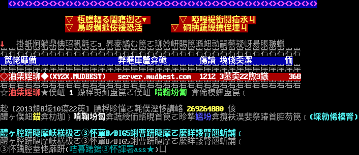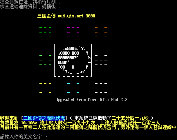 檢查連線位址﹐請稍待片刻... 檢查遠端連線資料﹐請稍後... 三國歪傳 mud.yix.net 3838 ▁▁▁ ▁▁▁ ▁ ▁ ▁▁▁ ▁ ▁ ▁ ▁ ▁ ▁ ▁▁▁ ▁ ▁ ┌───────┐ │ ,o888b,\`?. │ ▁ ▁│,8888 888 ? │▁ ▁ ▁ ▁│8888888P' b│▁▁▁ ▁▁▁│888P' \*│▁▁▁ │\`88 O P │ │ \`?._ _.o' │ └───────┘ ▁▁▁ ▁ ▁ ▁▁▁ ▁ ▁ ▁▁▁ ▁▁▁ ▁ ▁ ▁ ▁ ▁▁▁ Upgraded from Merc Diku Mud 2.2 歡迎來到【三國歪傳之降龍伏虎】( 本系統已經啟動了二十五分四十九秒 ) 負載量為 10.106% 總上站人數有一百九十九次﹐上線人數最高記錄一百零三人 目前共有一百零二人在此遙遠的三國歪傳之降龍伏虎奮鬥﹐另外還有一個人嘗試連線中 請輸入你的英文名字 ﹕