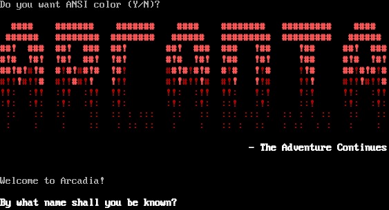 Do you want ANSI color (Y/N)? #​### #​###### #​###### #​### #​####### #​######## #​### #​##### #​####### #​####### #​##### #​######## #​######## #​##### ##! ### ##! ### ##! ##! ### ### !## !## ##! ### #!# !#! !#! ##! !#! #!# !#! !## !#! !## #!# !#! ##!#!#!# #!#!##!# !#! ##!#!#!# #!# !!# !!# ##!#!#!# #!!!#!!# #!!##!! !!! #!!#!!!# #!! !!# !!! #!!!#!!# !!: :!! :!! :!! !!: !!: :!! !!: !:! !:! !!: :!! :!: :!: :!: :!: :!: :!: :!: ::! :!: ::! :!: :!: :: :: :: :: :: : ::: :: :: ::: ::: : :: : : :: :: :: : : : :: : :: :: : : :: : :: : :: : : : : - The Adventure Continues Welcome to Arcadia! By what name shall you be known?